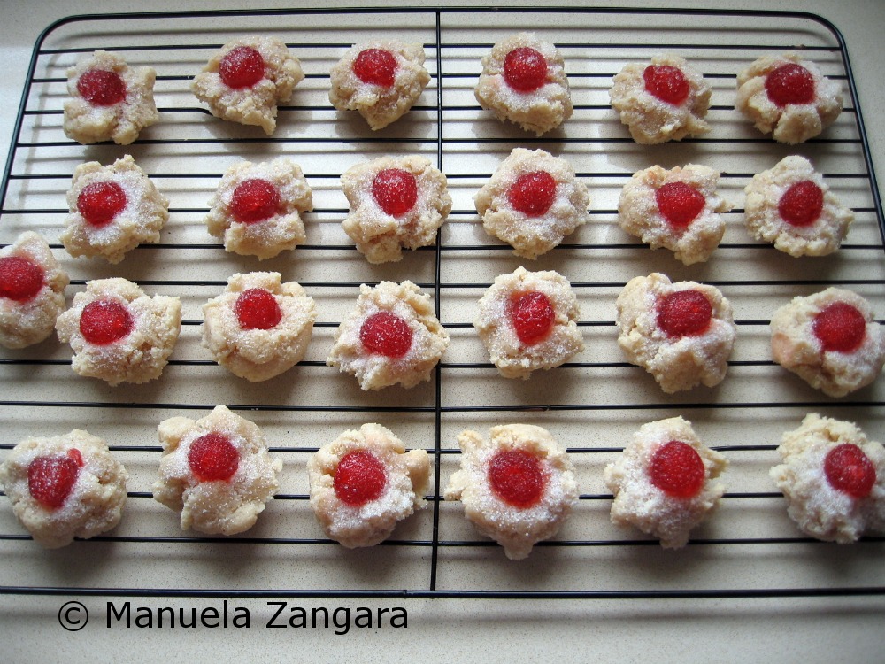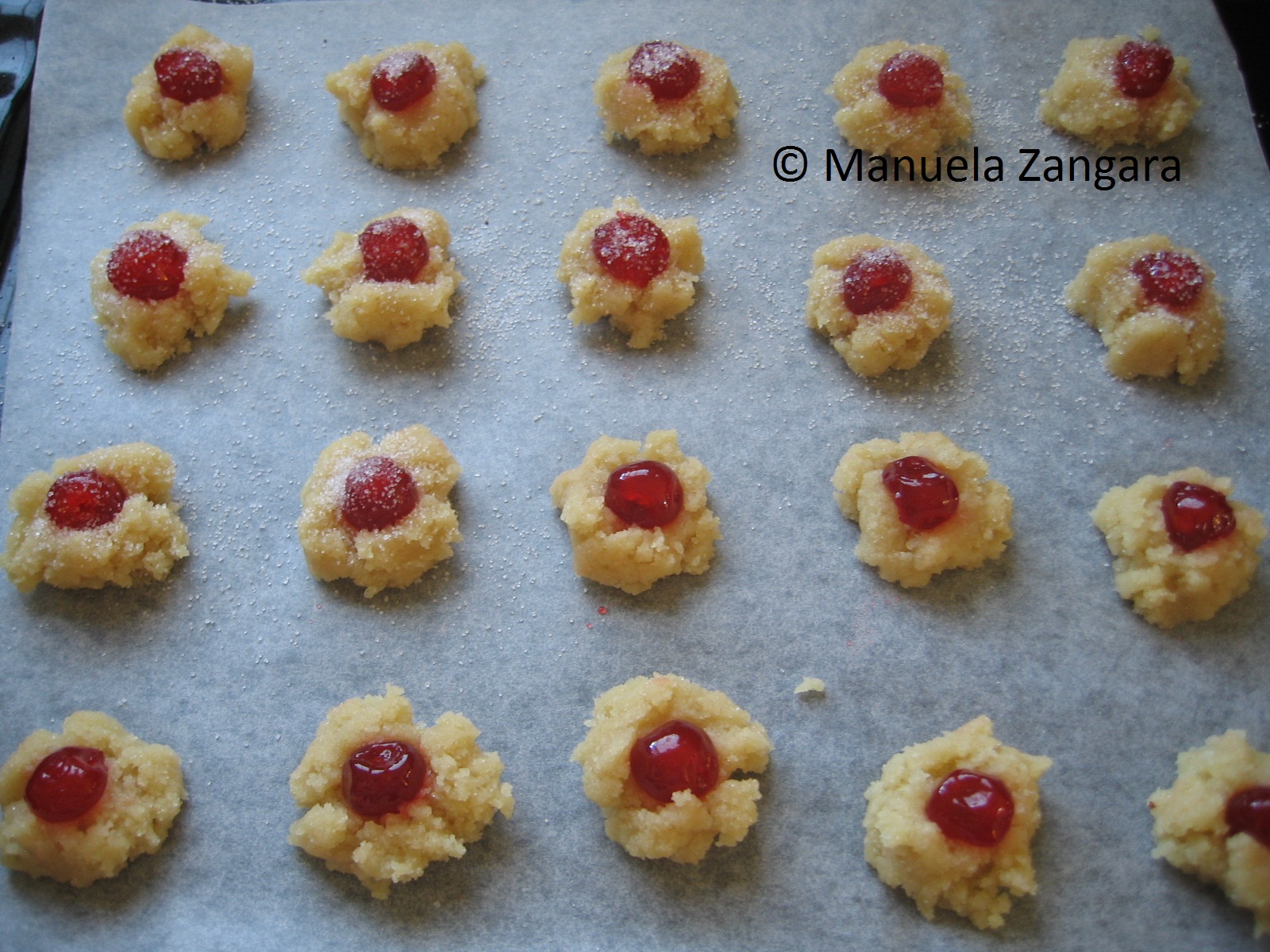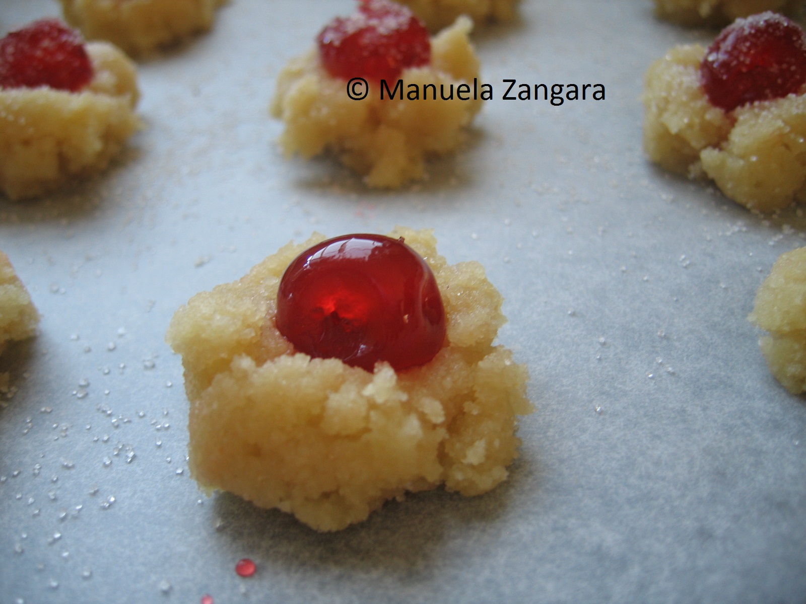 Put spoonfuls of dough on a baking tray covered with baking paper. Make sure to leave some space between the cookies as they will expand while baking. Add a cherry on each spoonful of dough and sprinkle a little caster sugar on the top.