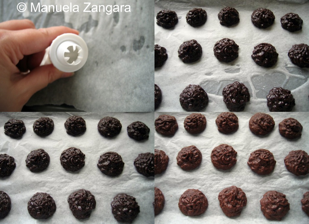 Pipe this mixture with a piping bag on cookie sheets covered with baking paper (I used a decorative nozzle). Let them rest at room temperature overnight, then bake them in a preheated fan forced oven at 190°C – 375ºF for about 6-7 minutes. When ready, let them cool down completely on the cookie sheets before trying to detach them or they will break.