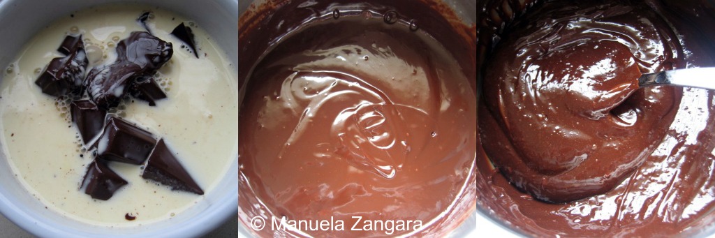 Now you can make your whipped chocolate ganache. Put the cream in a little pot and heat it up until almost boiling. Pour it on top of the roughly chopped chocolate and let it rest, without stirring, for 5 to 10 minutes. Now mix it with a spoon and then whip it with an electric hand mixer for 5 minutes.