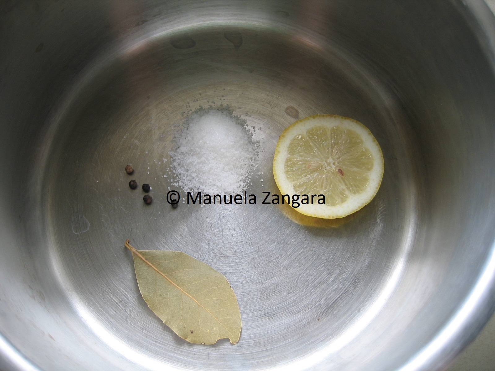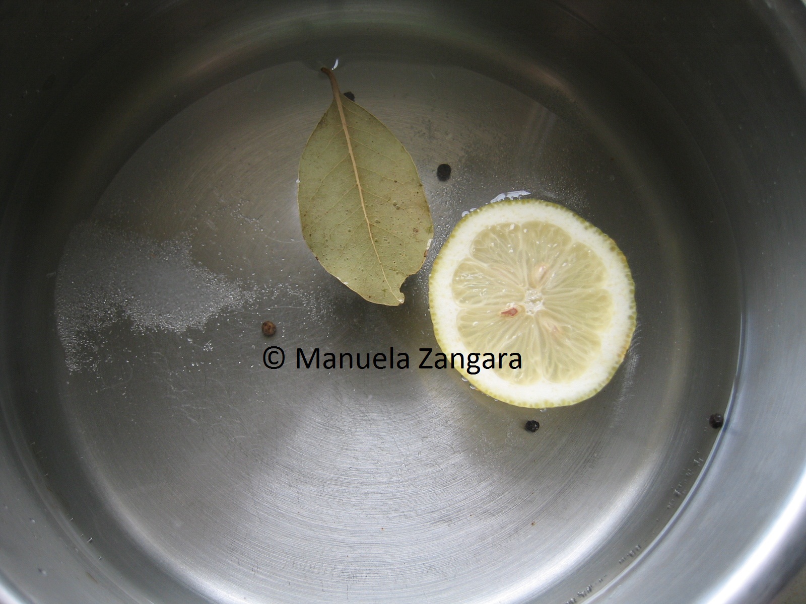 Put the bay leaf, pepper corns, slice of lemon and salt in a pot.