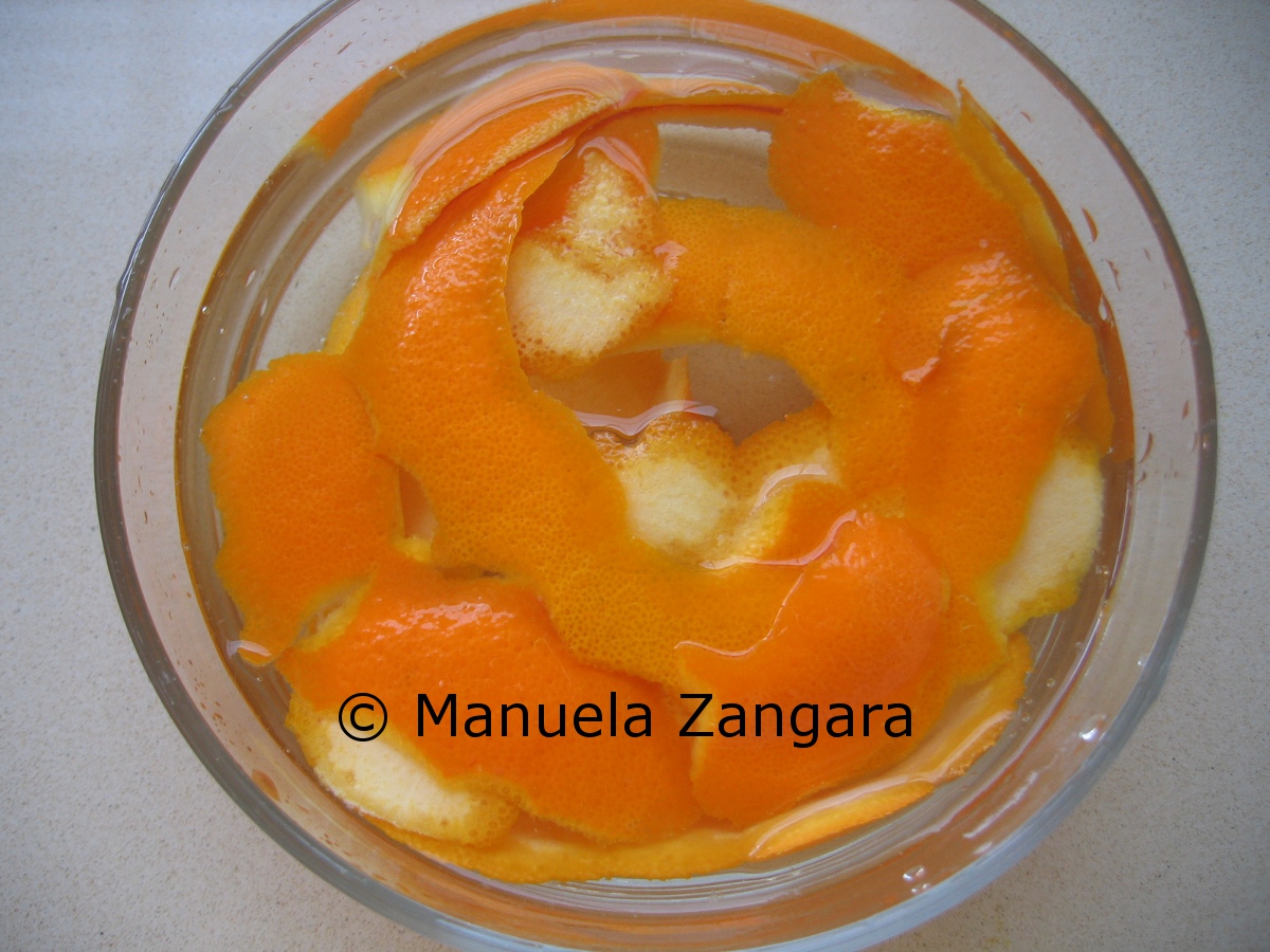Peel the oranges and put the zests in a container filled with water.  Keep the zests in it for 3 days often changing the water.