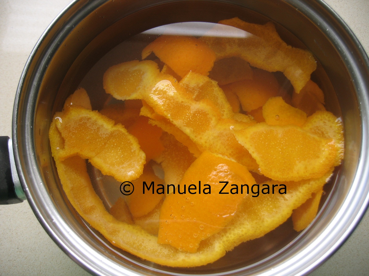 Put the zests in a pot with water, bring to the boil and simmer for 10 minutes.  Repeat this step for 3 times, changing the water each time.