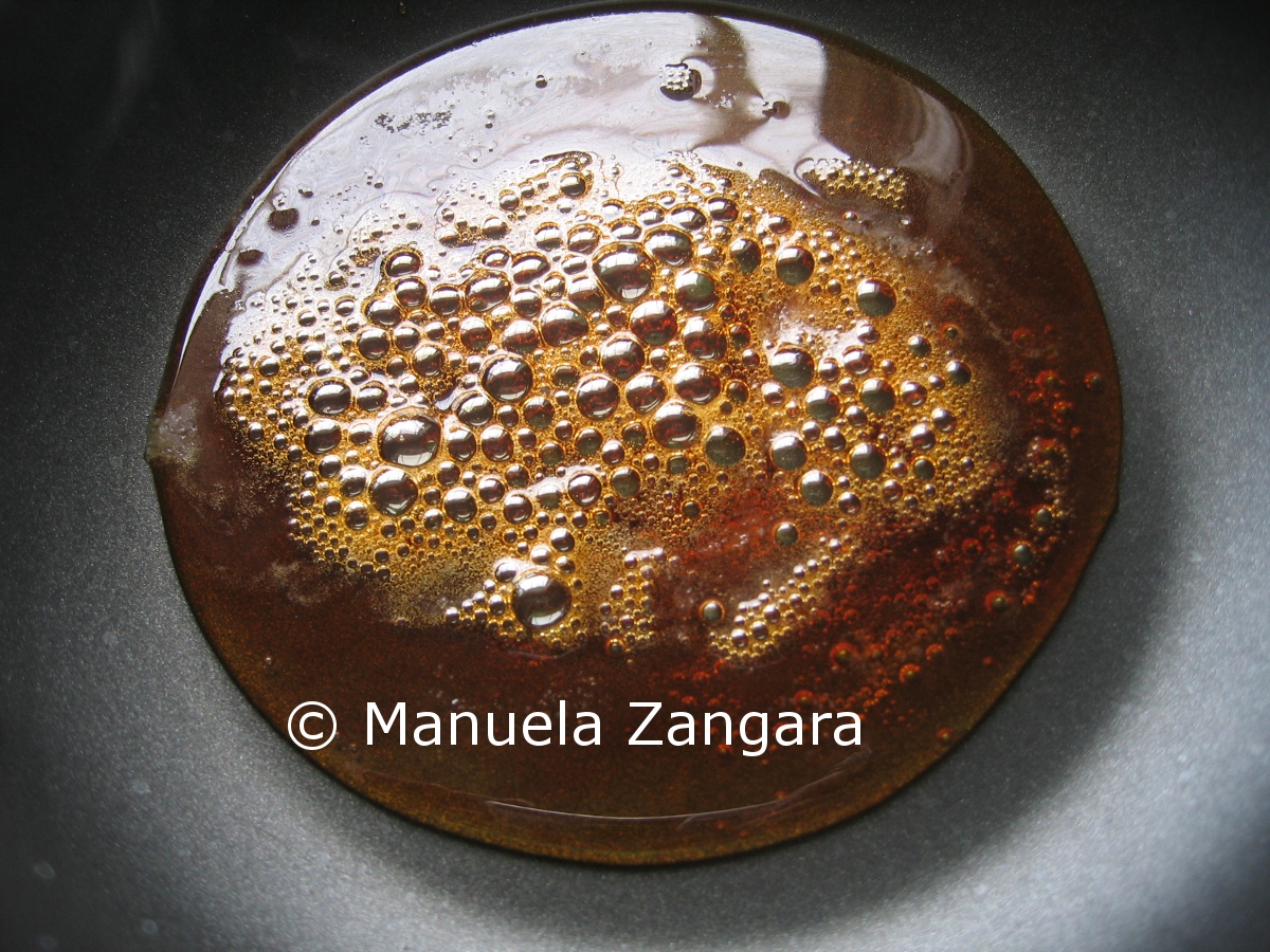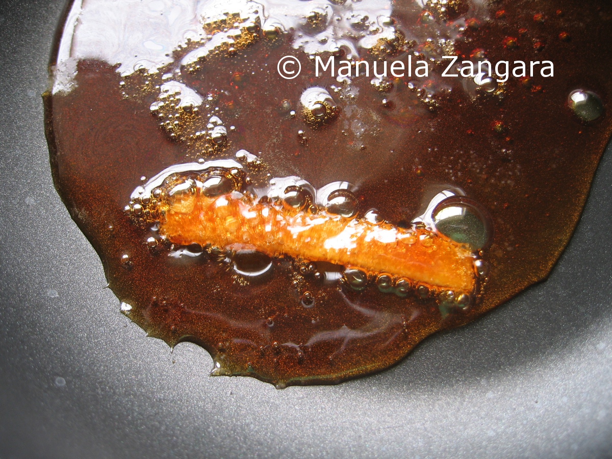 Add the orange zests one by one and stir, until they absorb all the melted sugar.