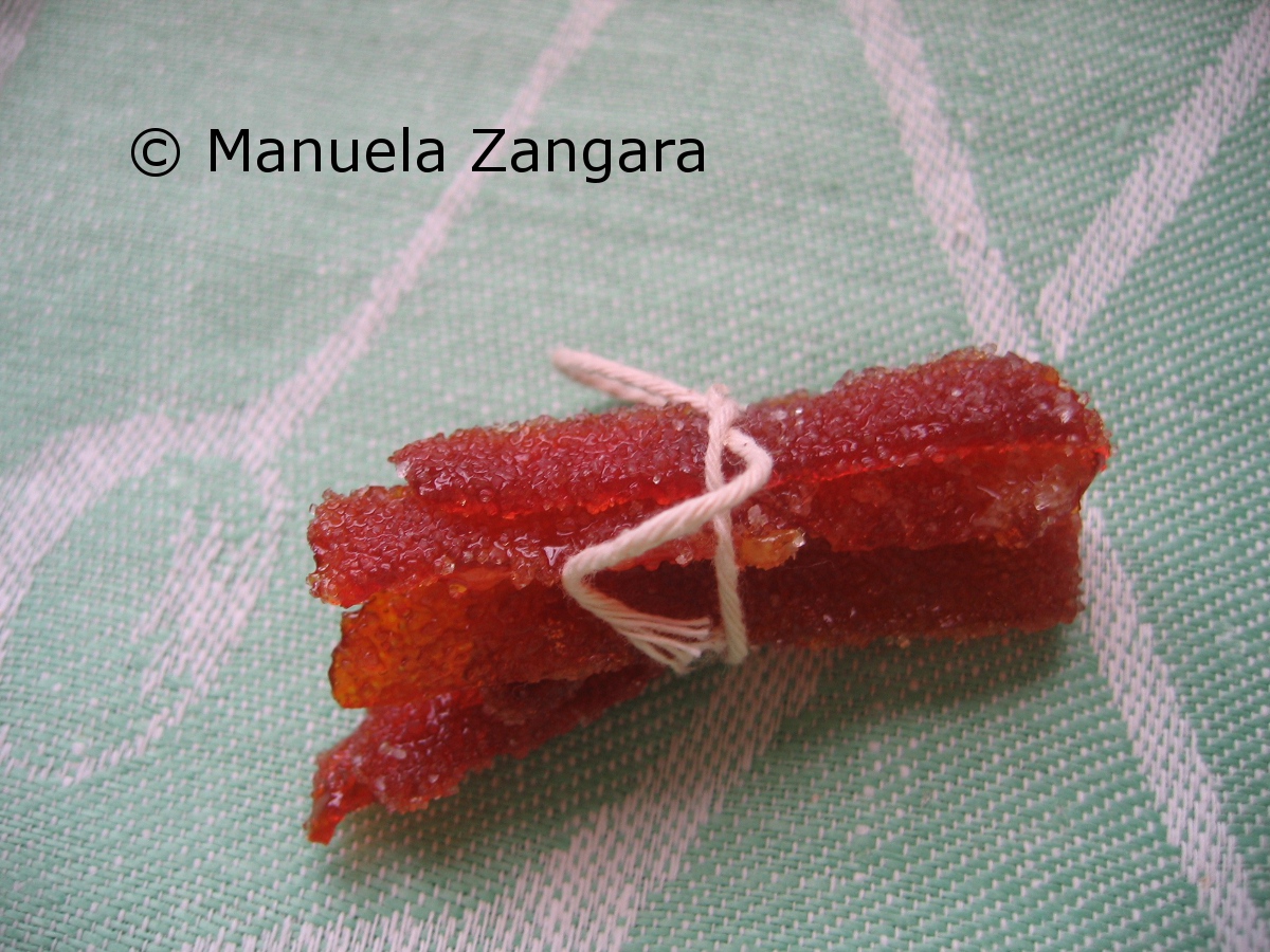 This is a typical Italian winter sweet and is often (but not only) used as a decoration for other desserts or served at the end of a meal with some coffee.  My mom used to make lots of them for Christmas because that is the time of the year when oranges are at their best.  Candied orange zests are really tasty and can be eaten plain or dipped in dark chocolate.
