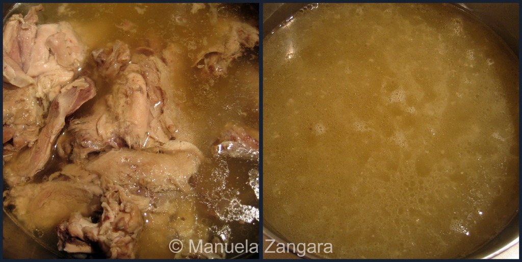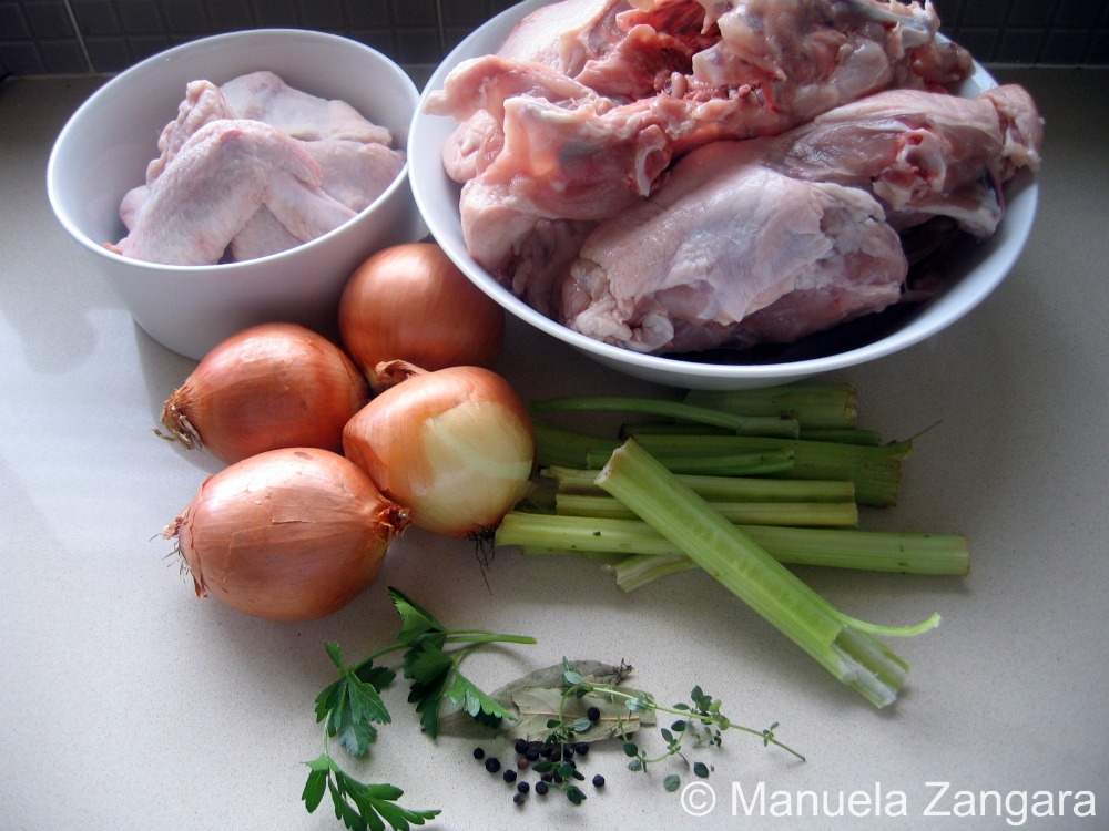Peta, of the blog Peta Eats, was our lovely hostess for the Daring Cook’s September 2011 challenge, “Stock to Soup to Consommé”. We were taught the meaning between the three dishes, how to make a crystal clear Consommé if we so chose to do so, and encouraged to share our own delicious soup recipes! When I saw this month’s challenge I was a bit intimidated as I had never made Consommé before, but then I thought that this would be a great chance to learn something new. Besides, it is still a bit cold down here, so what better challenge than to make a nice hearty soup? The challenge was mainly about making stock from scratch, turning it into a soup and serving it with an accompaniment of our choice. The Consommé bit was an “optional step”, but I was not going to miss out on the chance to try it! As it was my first attempt, I decided to make it from a simple home made white chicken stock (which means the chicken bones are not roasted prior to being cooked in the stock). I also chose what I thought was the easiest method to make Consommé: the freeze (gelatine) filtration method. Choosing the accompaniment was easy… being Italian, I chose to make the most classic Italian accompaniment for Consommé: tortellini (stuffed pasta filled with pork meat, prosciutto, mortadella and Parmigiano Reggiano). To be precise, I made the tortellini version from Bologna (there are many variations in Italy with slightly different fillings). Then on the spur of the moment I decided to “spice up” my basic Consommé and added some saffron to it… it tasted great and I loved the intense yellow colour!