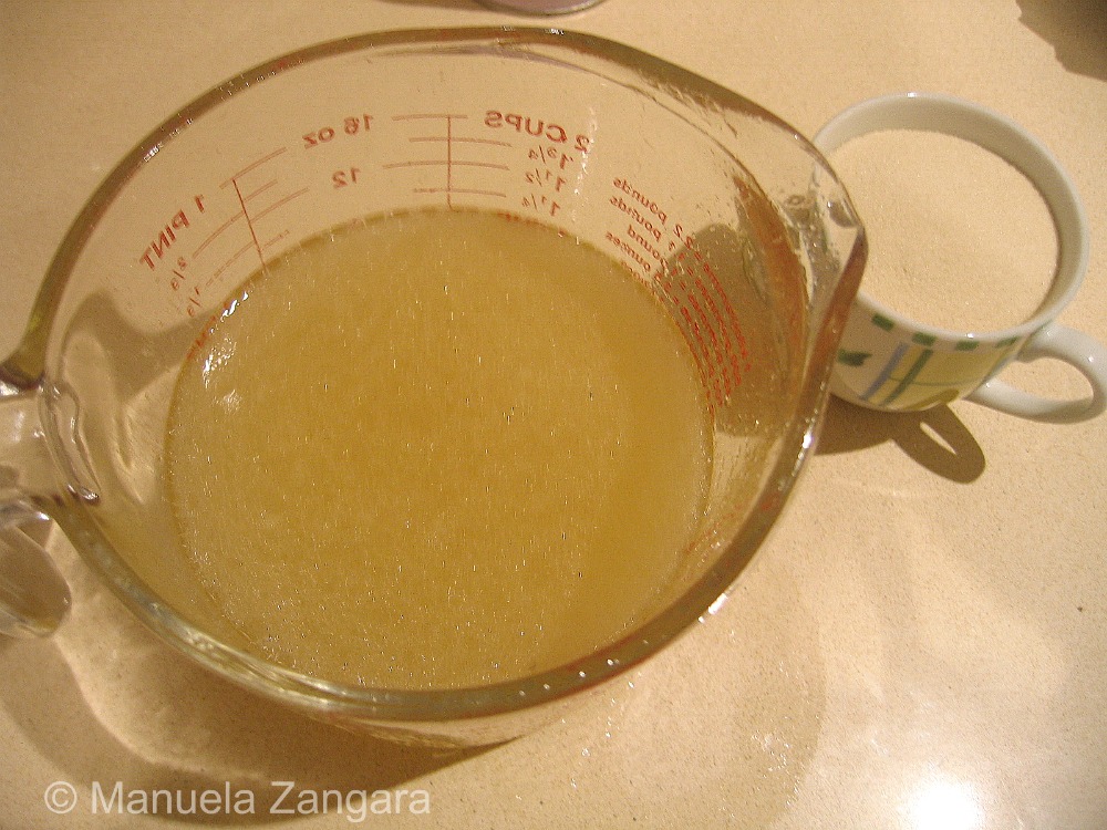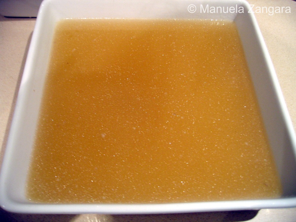 Measure the stock and enough gelatine powder to set it (follow the instructions on the package for quantities, as they vary). Dissolve the gelatine powder in 1 cup/240 ml of the stock. Then add it to the remaining hot stock and dissolve it by mixing it well.