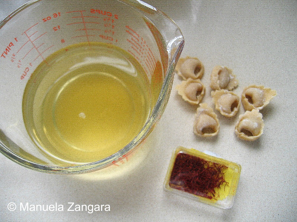 While the tortellini are cooking, warm up your Consommé, add salt to taste and a pinch of saffron to it. Mix well.