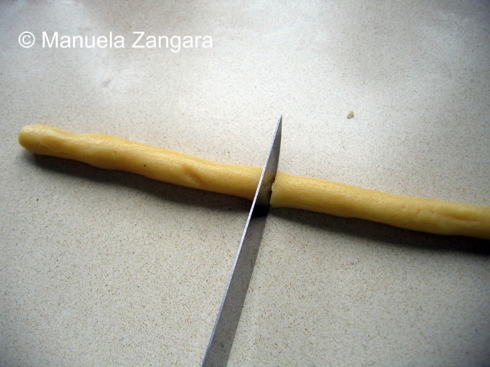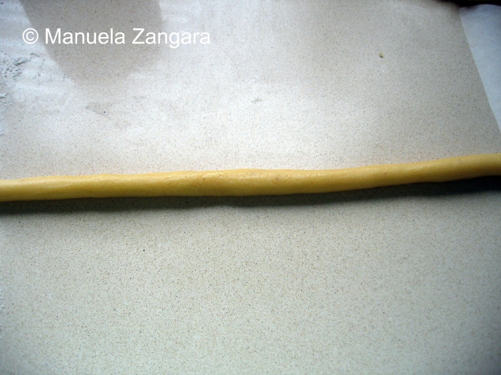 Then take it out of the fridge and roll it into 1.5 cm thick strips.