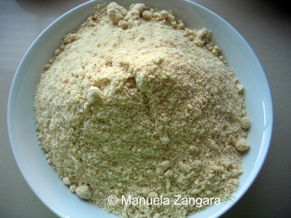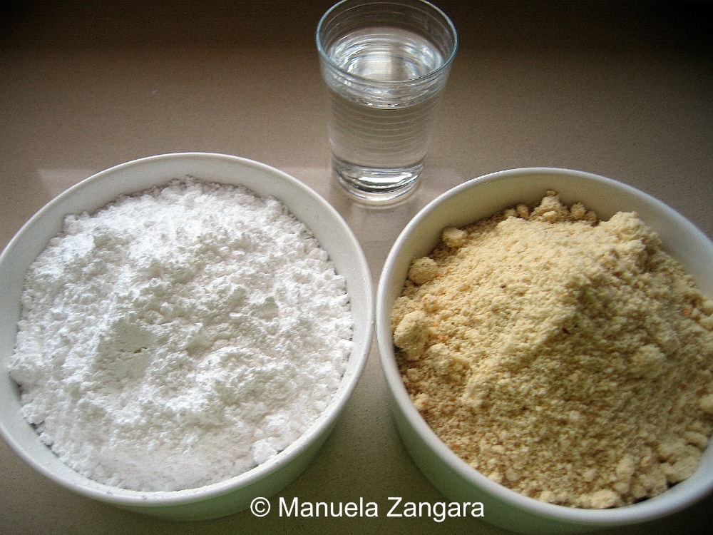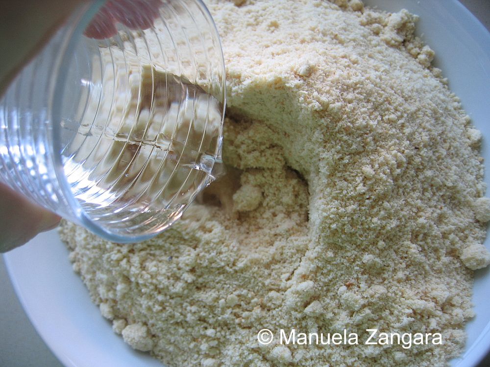 The following day, put the almond meal and icing sugar in a big bowl. Mix them well and add the almond essence (optional) and the water slowly while kneading with your hands.