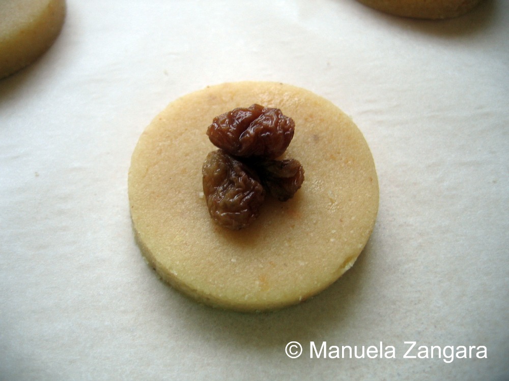 Put 3 raisins on half of the circles and cover them with the remaining circles.