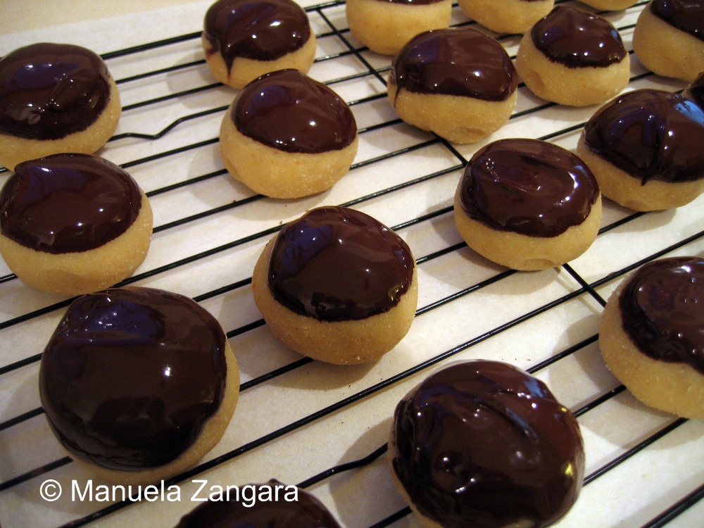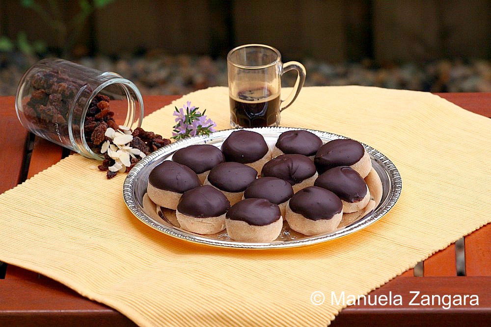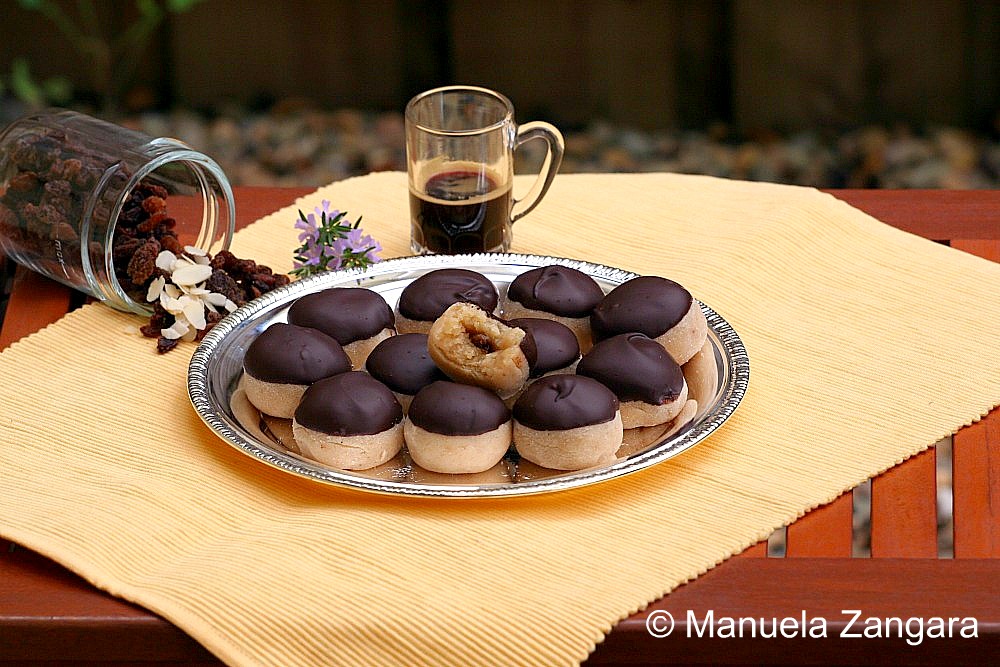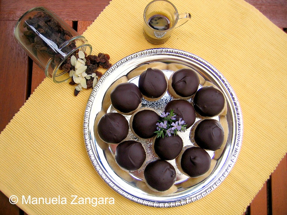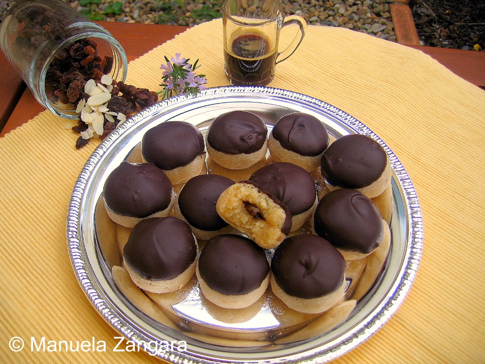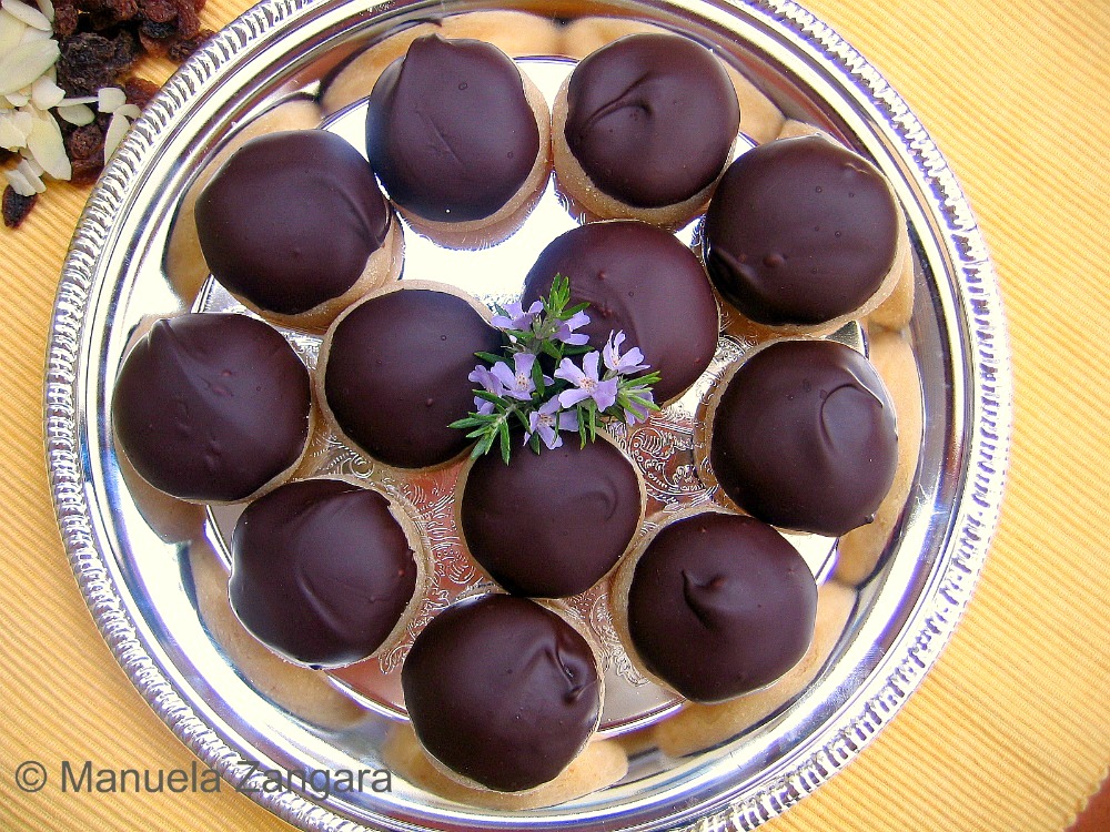 A few days ago I got an email from Sandra of Sandra’s Easy Cooking asking me if I would write a guest post for her fantastic blog. Would I?? Of course I would! I felt so flattered and honored to be asked by one of my favorite foodies to be a guest over at her virtual kitchen! I immediately started thinking about what recipe to post… I wanted something that I hadn’t posted yet and something that represented me and my site. I was lucky enough to have just the recipe! I had made these sweets for a friend’s party a few days before and I hadn’t blogged about them yet. Perfect! They are marzipan balls filled with rum soaked raisins and topped with melted dark chocolate. They are traditional Sicilian sweets and I love the chocolate topping and the liqueur soaked raisins hidden inside. Before starting to prepare these sweets I want to THANK Sandra for giving me the opportunity to be a guest over at her beautiful site and for being such a supportive and lovely fellow foodie! Thank You Sandra… you know how much I appreciate your delicious recipes and your mouthwatering pictures! 🙂