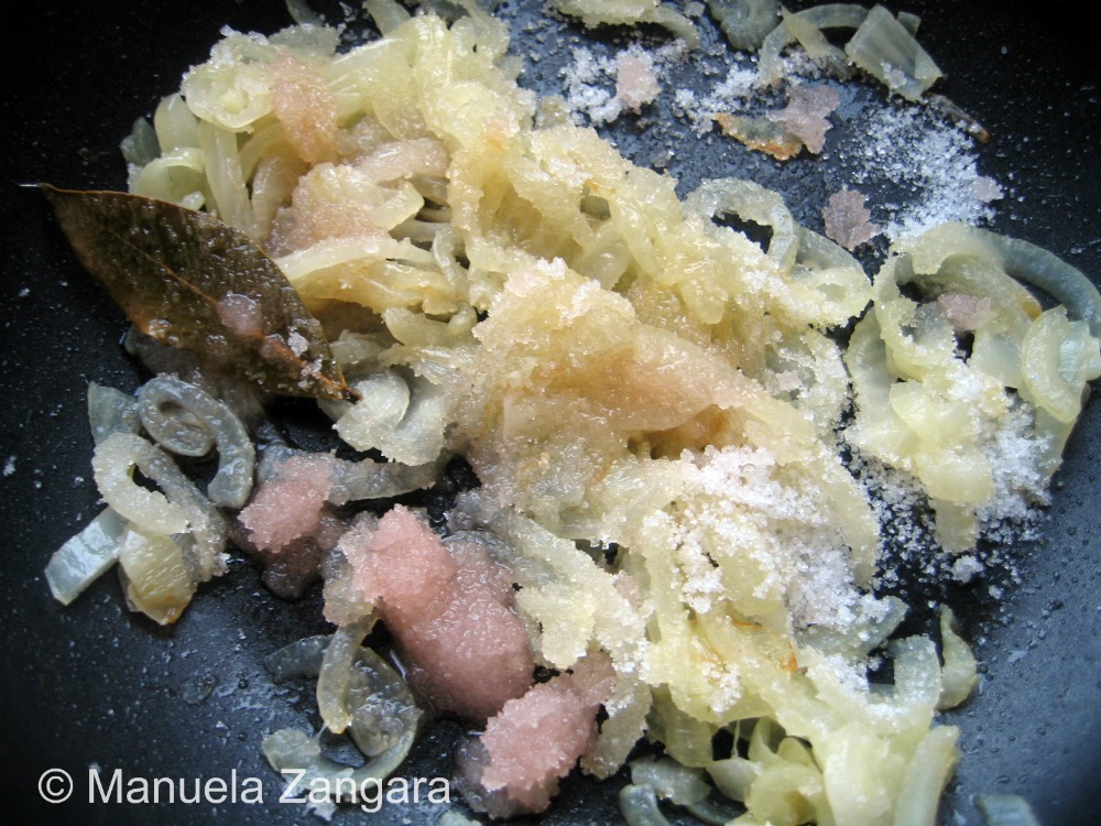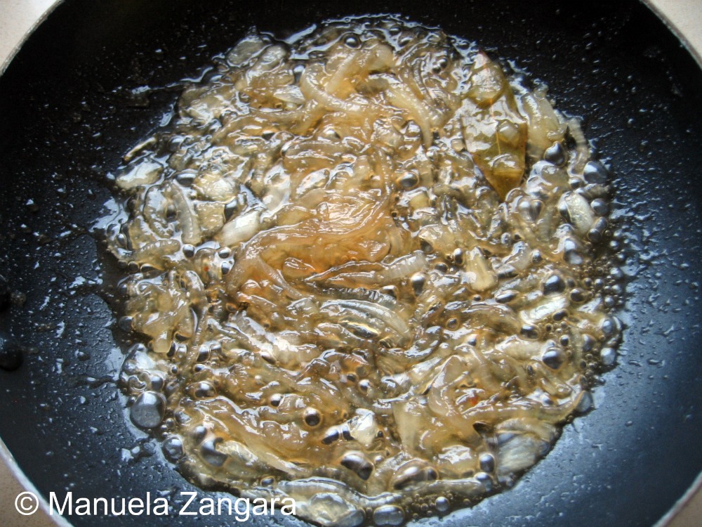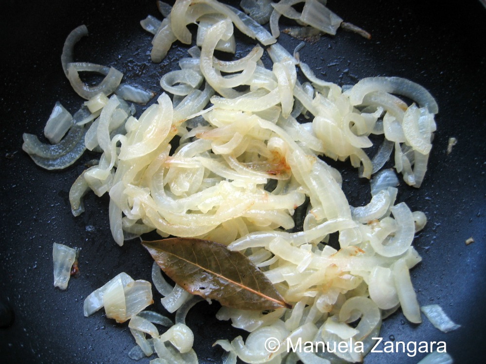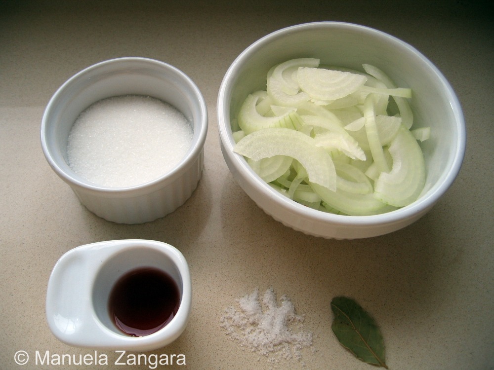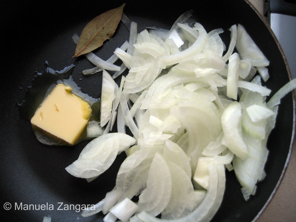 Now you can prepare the onion jam. Slice the onion and put it in a sauce pan with the bay leaf and butter and let it cook covered on a very low flame until translucent.