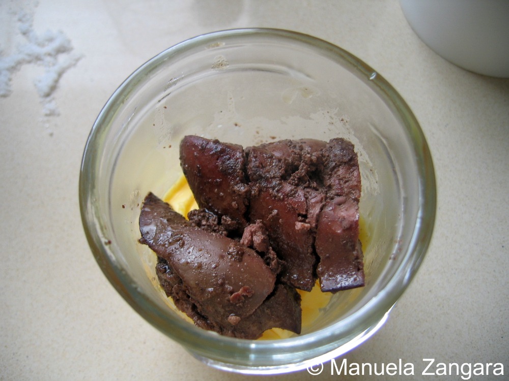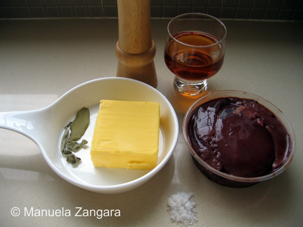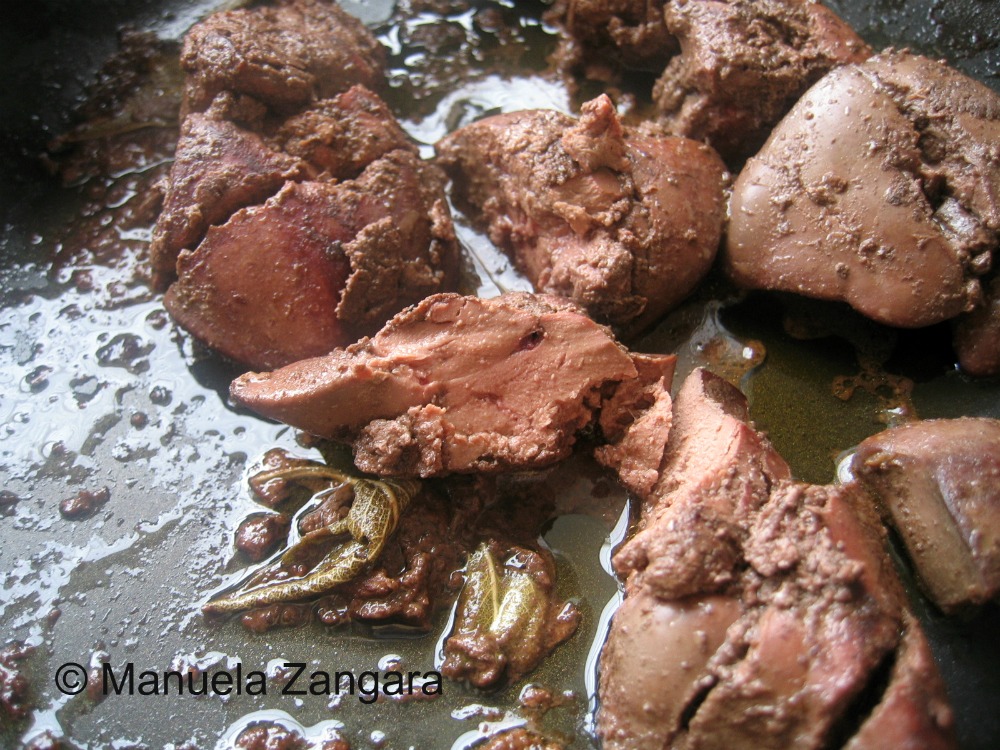Wash the duck liver and leave it in water for at least 30 minutes. This will make it less bitter. Put it in a sauce pan with the bay leaf, sage and 20 gms of butter. Let it cook on a medium/high flame and turn it over a couple of times.
