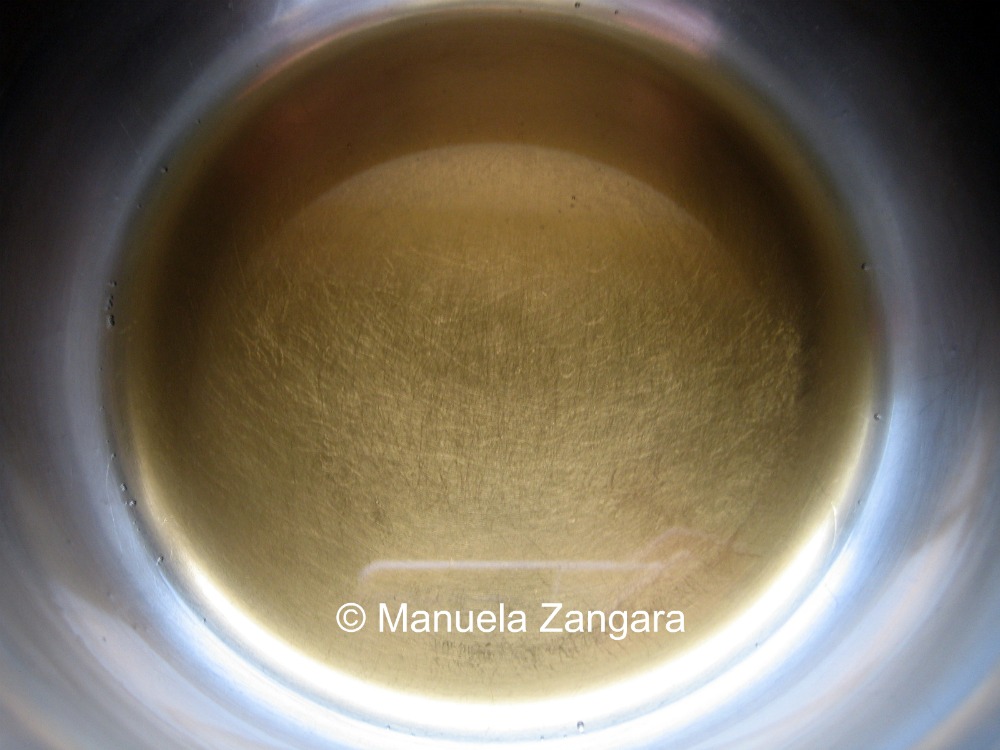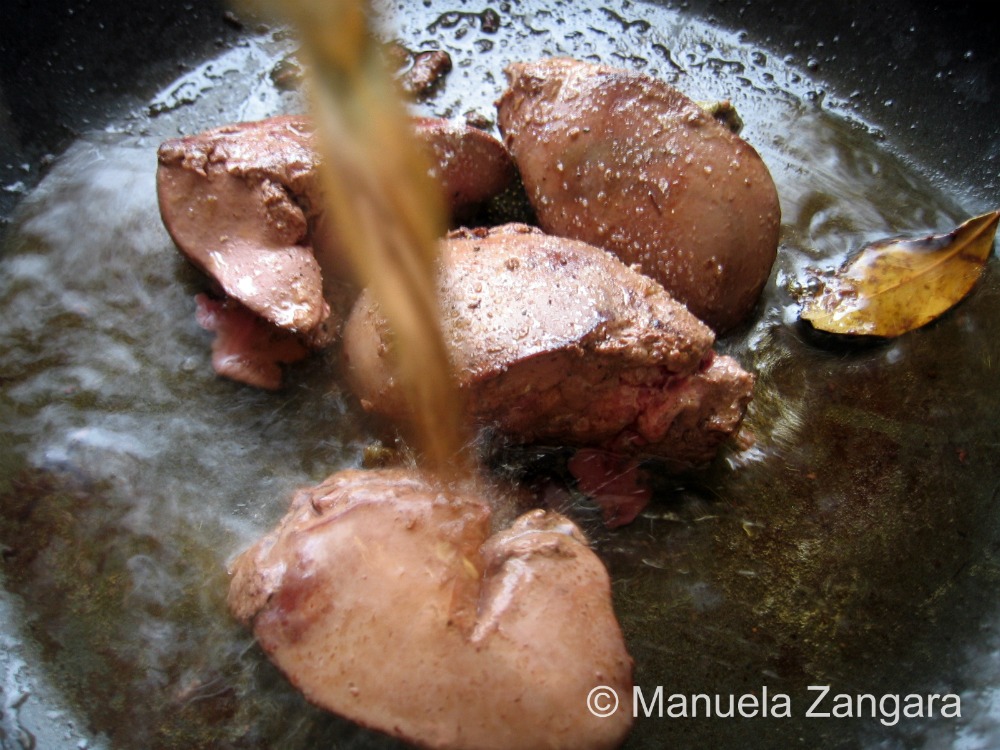 Then add the cognac and let the alcohol evaporate. The liver has to remain slightly pink on the inside. When the liver is ready, let it cool down a little.