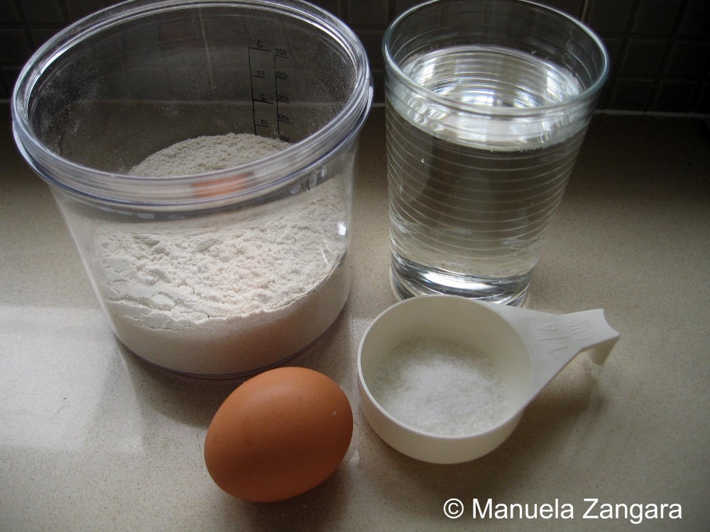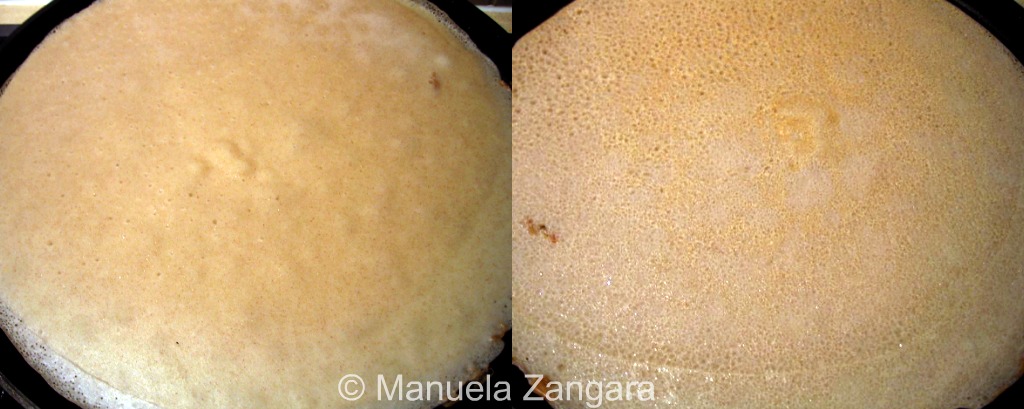 Take a non stick frying pan and put it on the fire. When hot add ¼ tsp of butter and a ladle of batter by swirling the pan so the batter coats the base of the pan. You want to make the coating thin (about 1.5 mm thick). When the surface of the galette dries up, it is time to flip it over. Do so by using a plastic spatula to loosen its sides first and then flip it over. Cook it for a minute more, then remove it from the pan and keep it aside.
