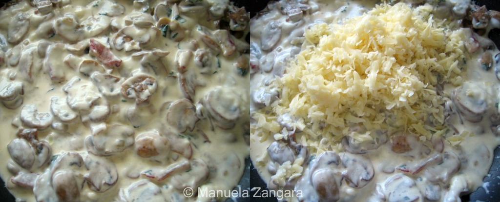 When cool, add the béchamel, cream and grated Emmenthal cheese. Mix well and keep aside.