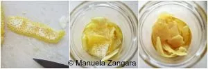 Sous vide the lemon peel & alcohol in a mason jar for 2 hours at 57 C. I prefer to use organic non waxed lemons, preferably with a touch of green still on them.