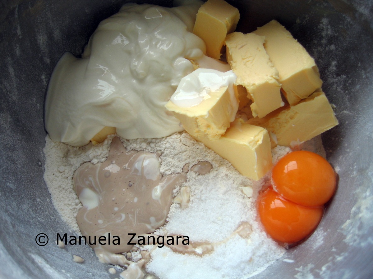 Put the flour, margarine, salt, dissolved yeast, sugar, egg yolks and yogurt in a mixer with a dough hook and knead for a couple of minutes, till the dough looks smooth. You can also knead this by hand if you like.