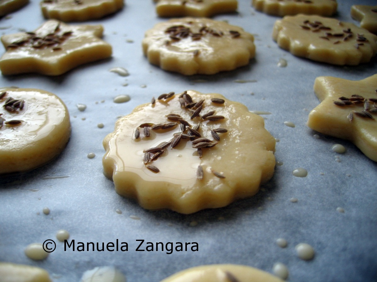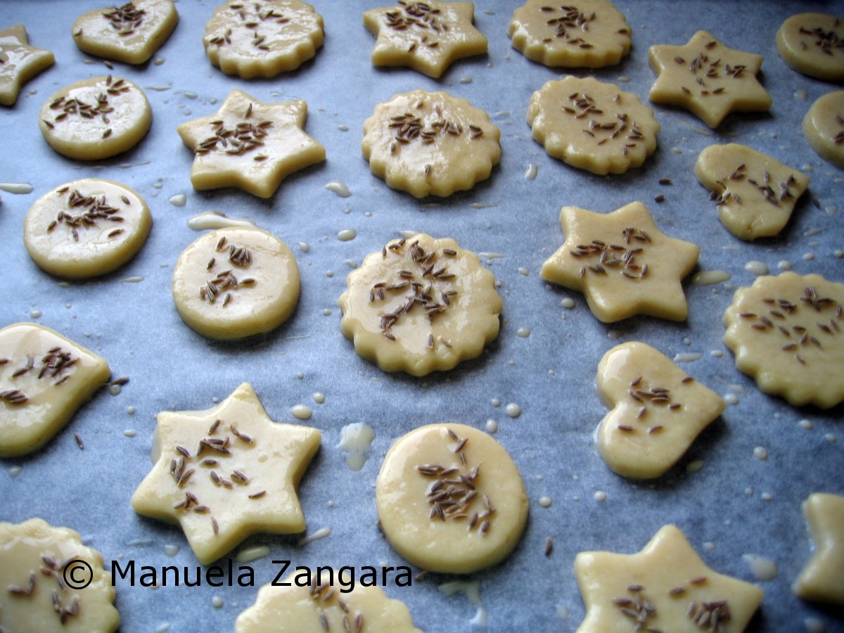 Place them on an oven tray lined with baking paper. Brush them with egg wash and sprinkle some cumin seeds on the top.
