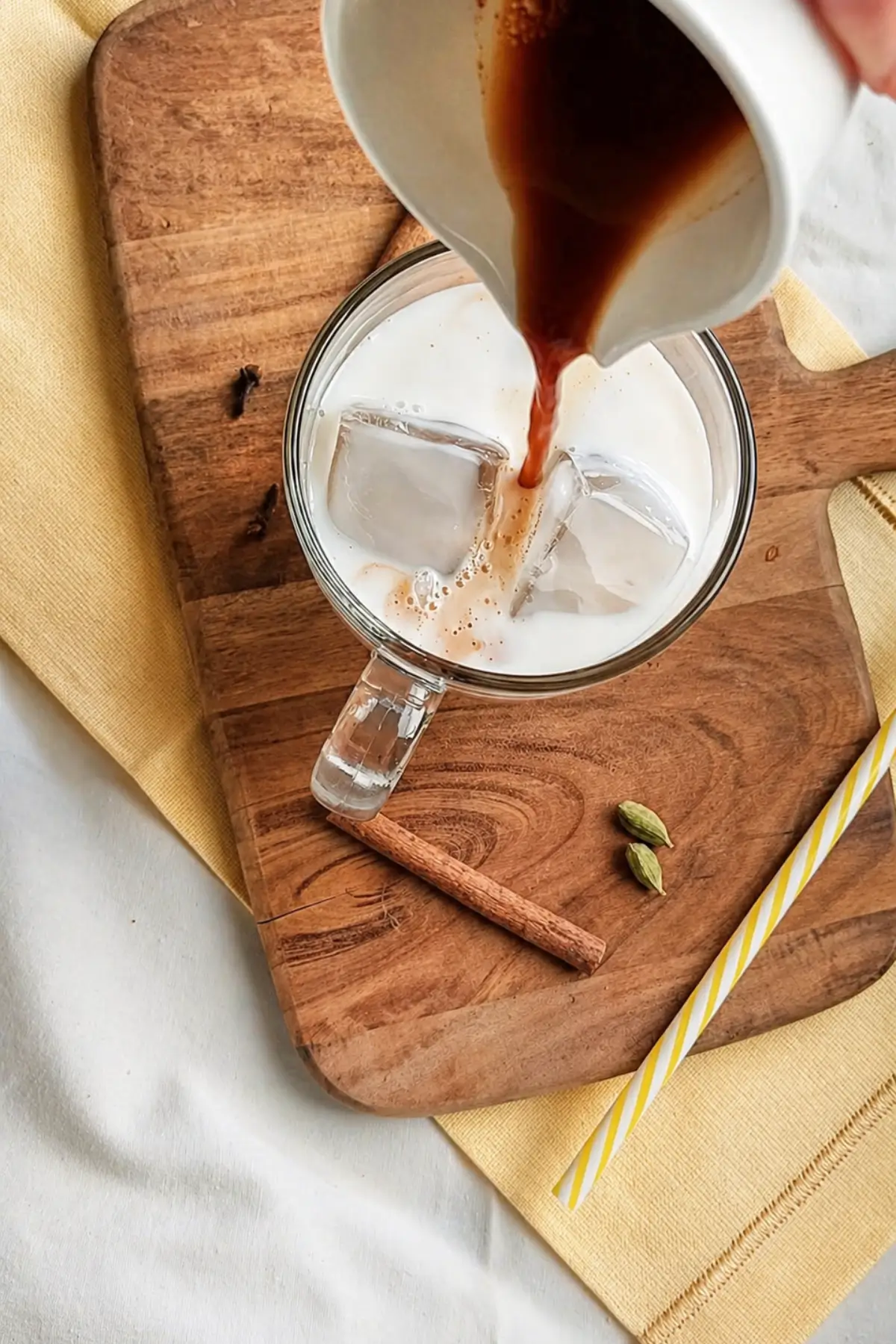 Dirty Iced Chai Latte – Add 1 shot of cooled espresso when serving. Keep the same ice, milk, and chai concentrate, then stir everything together in the glass.