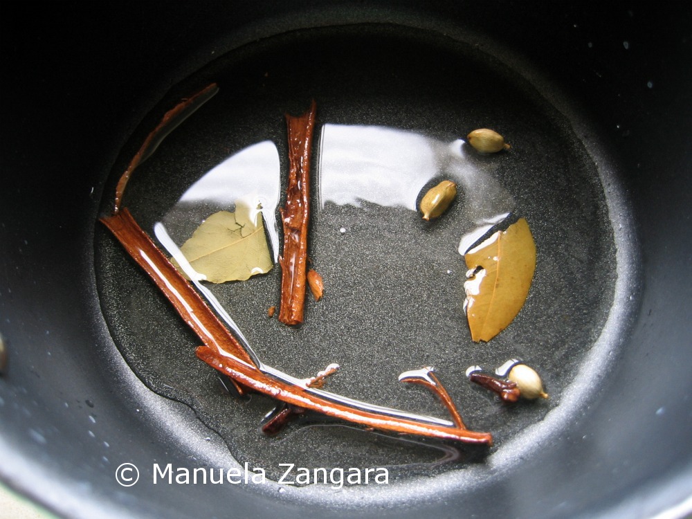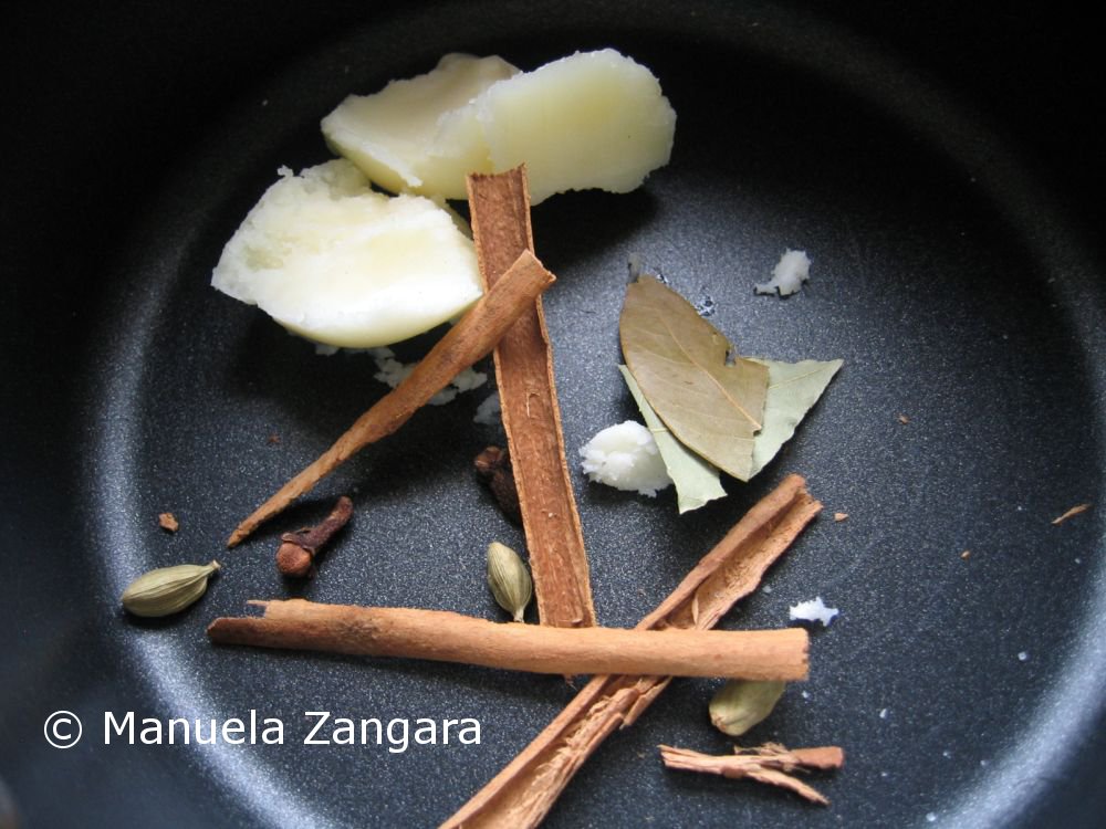 Put the ghee, cloves, cinnamon, bay leaf and cardamom pods in a non-stick pot and sauté them for a couple of minutes on a medium- high flame.