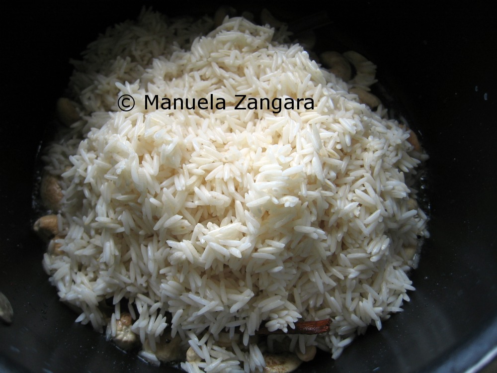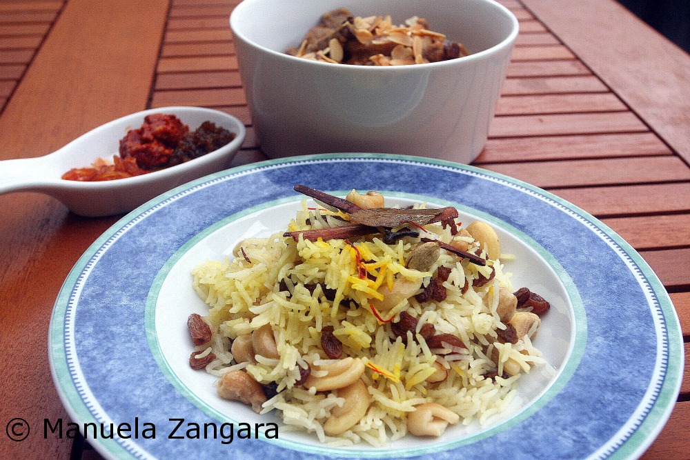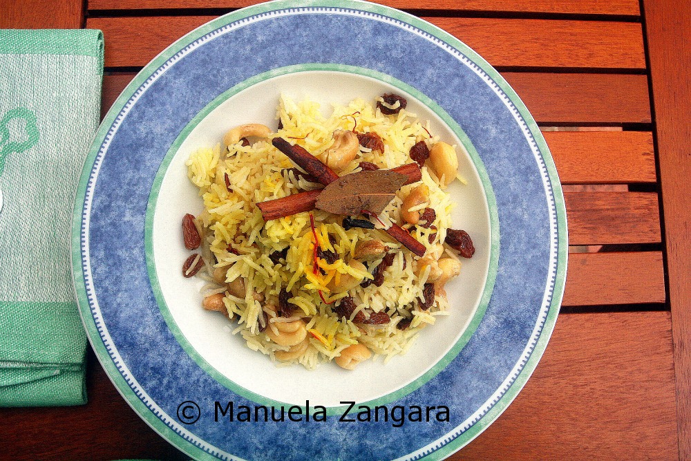 When we first moved to Sydney we did not know any good places to dine out in the city, so we asked around and received a few great suggestions. One of these quickly became one of our favourite restaurants: Abhi’s Indian Restaurant. The food is fantastic and some of their dishes are just plain delicious. Our favourites are Palak Patta Chat, Aloo Tikki and their Kashmiri Pulao. Now, I have to say I am very picky when it comes to rice and I tend to severely judge the quality of a restaurant by the way they cook their rice. So, when I first went to Abhi’s and had their Kashmiri Pulao I was sold… their rice is cooked to perfection, it is not sticky, the grains are all separated and the cashew nuts and raisins add crunchiness and sweetness to it. So, as it always happens when I like something, I set on a mission to try and replicate the dish in my kitchen. After a few attempts, I got my own recipe for this Pulao, that I called “Kashmiri” in honour of Abhi’s Kashmiri Pulao.