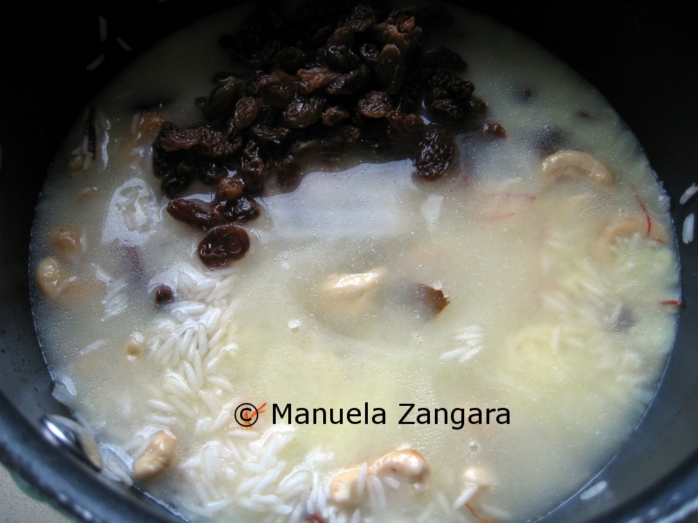 In the meantime, soak the raisins in hot water for 5 minutes. Dissolve the saffron threads in the hot milk and keep aside.