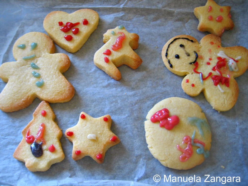 We have also been busy in the kitchen… today the girls and I have baked and decorated a batch of sugar cookies for Santa! Here they are… cute, eh? Victoria’s cookies are on the left and Georgia’s ones are on the right: