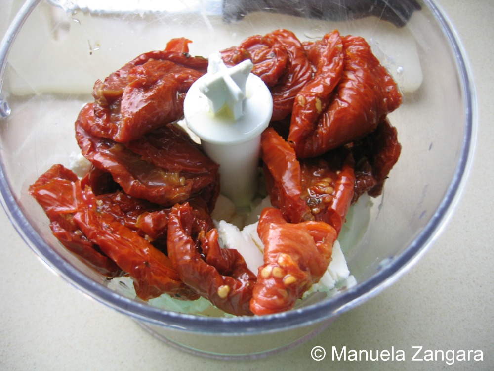 Blend the chèvre and sundried tomatoes together until smooth and fill your sandwiches.
