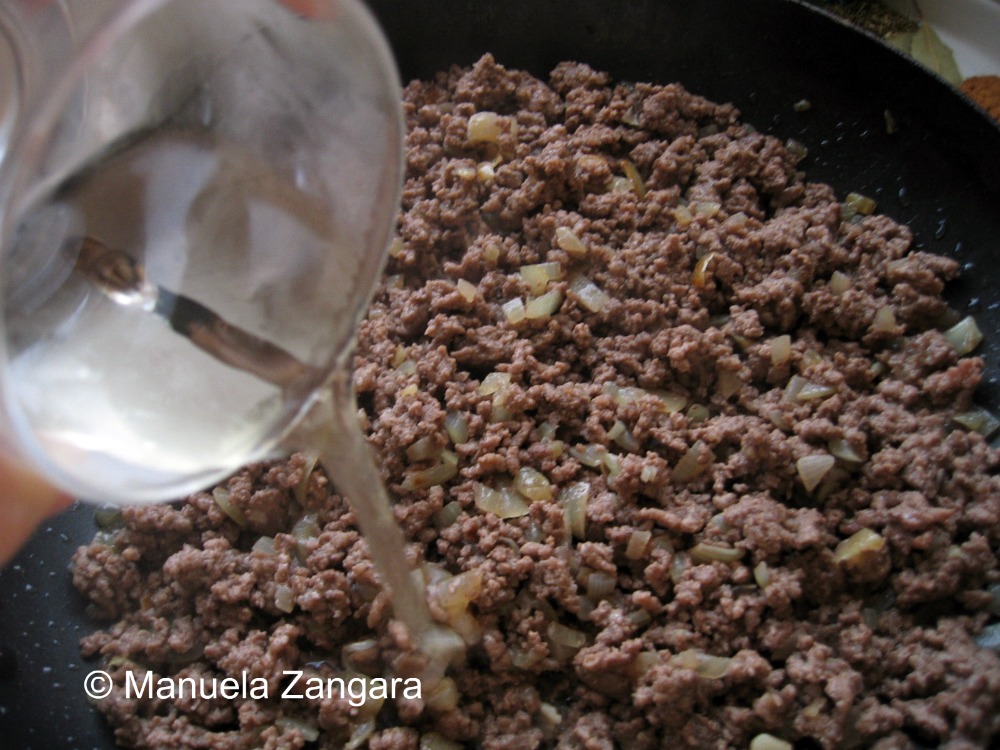 When the mince is brown, add the wine, increase the heat, and let the alcohol evaporate.