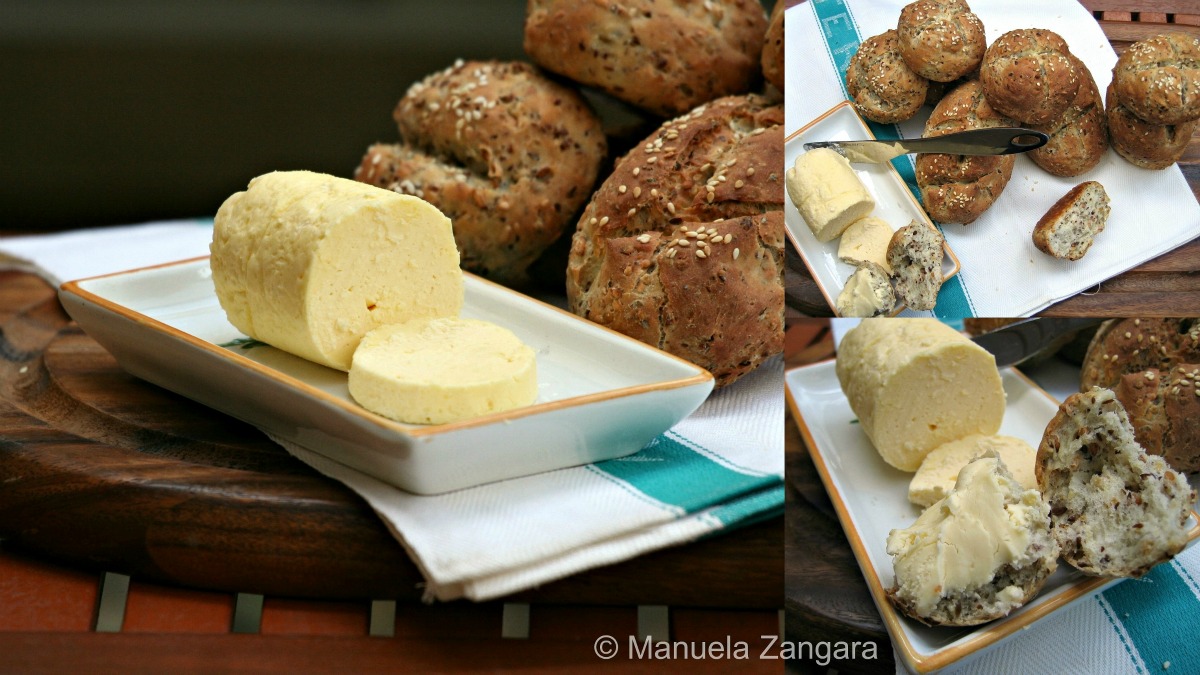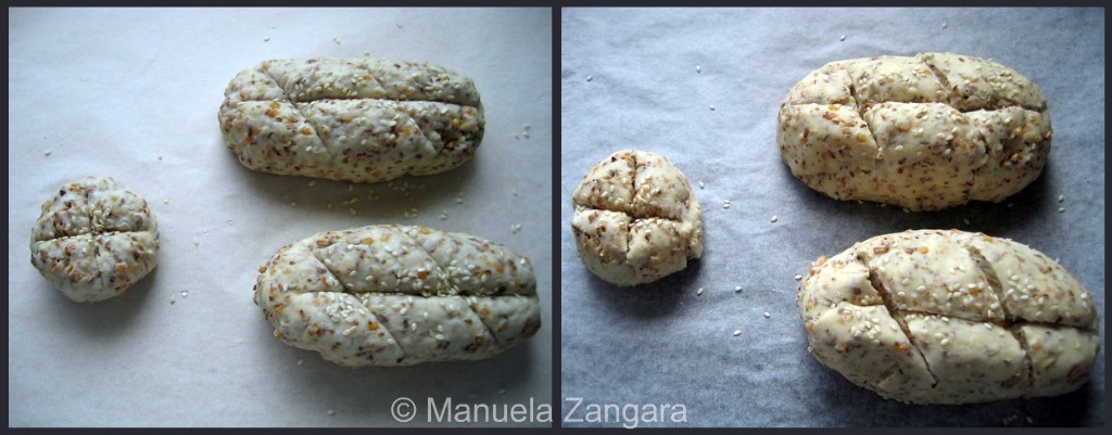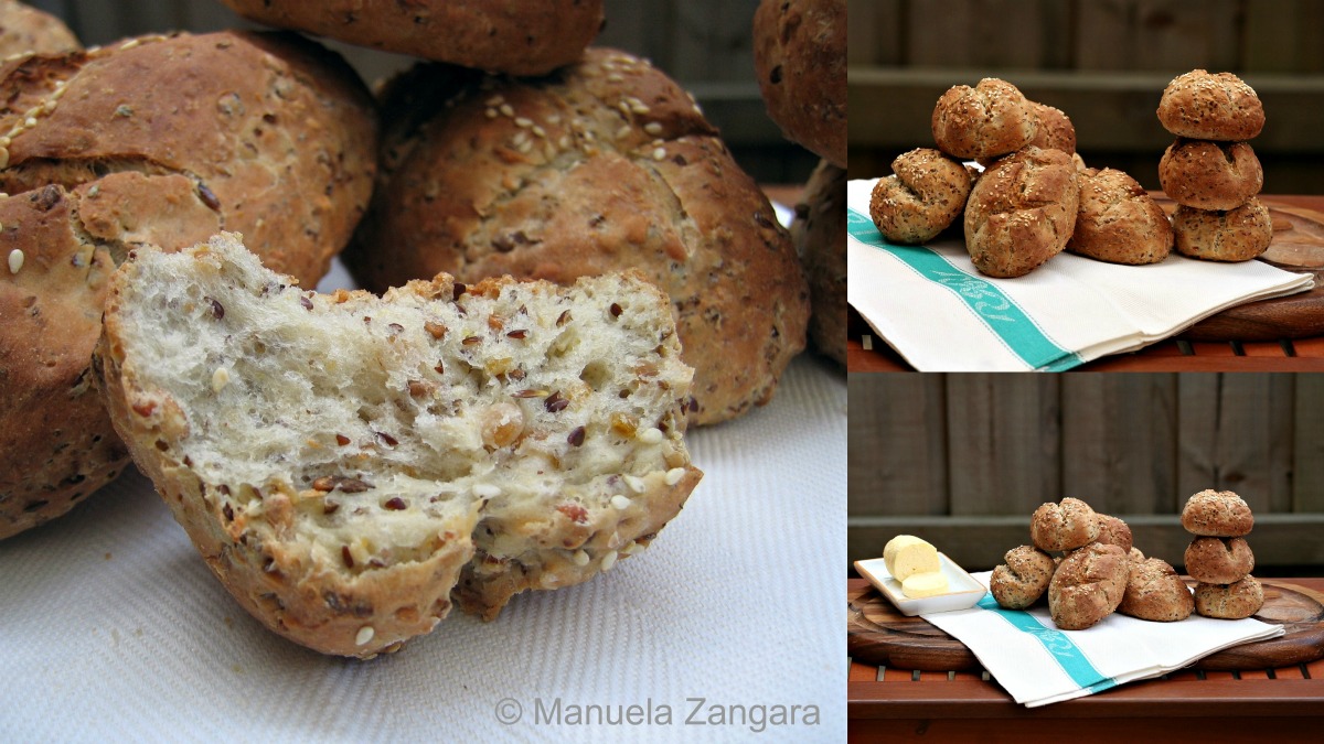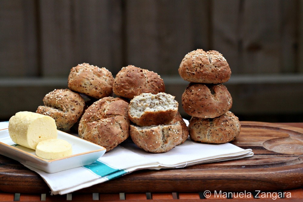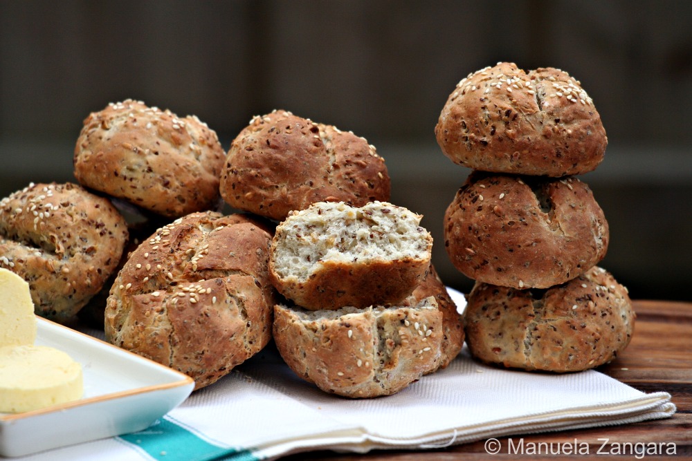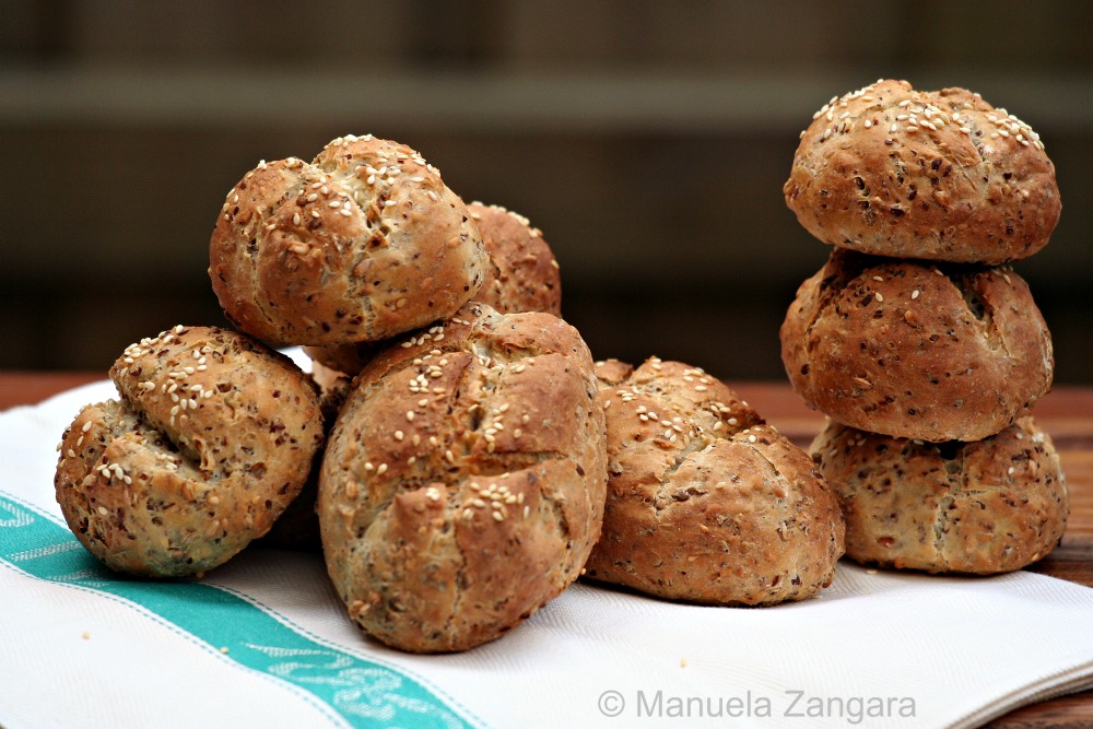 My girls love bread. They would eat bread all day long if I let them! So, in an attempt to give them something healthier, I am baking more bread than I used to. And I have taken up baking whole meal or multi grain breads more than white bread. This is a very easy recipe that you can make at home without too much hassle. It yields panini with a crunchy crust and a somewhat dense but soft crumb… which I think complements the multi grain texture of the flour. I also add sesame seeds on the top as I think they look pretty! These panini are great with some home-made salty butter and/or to accompany a nice bowl of warm soup!