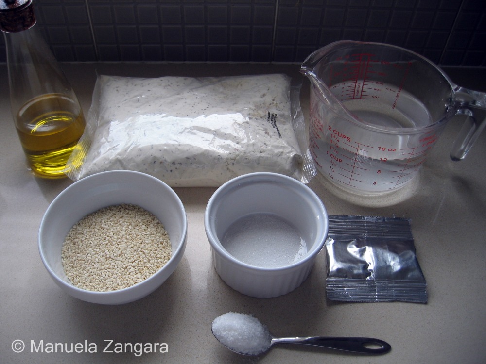 In the meantime put the multi grain flour, 2 tbsp of sesame seeds, salt and extra virgin olive oil in a mixer with a dough hook. When the yeast mixture is frothy pour it into the mixer. Knead for a couple of minutes, till the dough looks smooth. It must feel soft and elastic when you touch it. If you do not have a mixer, you can knead all the ingredients by hand for 5 to 10 minutes.