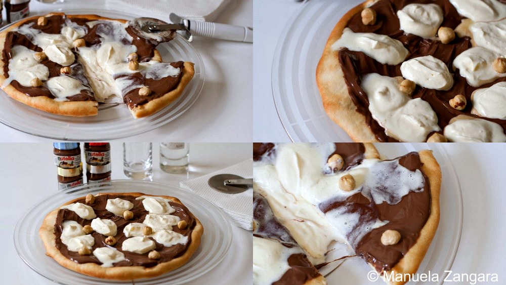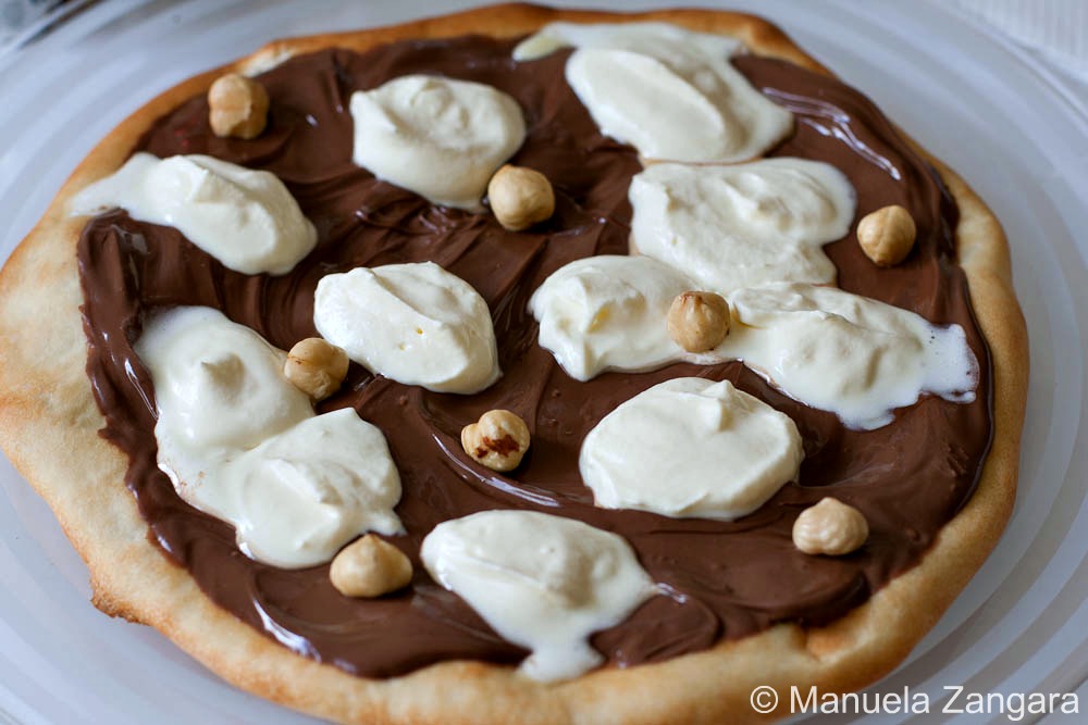 Yay! What a FANTASTIC day! I know… nowadays Nutella is famous all over the world. And that is awesome as so many people get to enjoy it! But you have to understand this: for Italian children, Nutella is the equivalent of Peanut Butter for American children. I was brought up eating “pane e Nutella” (Nutella on bread – well it was mainly on Panini al latte), literally. It was my favourite after school snack. And the thing is, I still LOVE it. To me it is total comfort food. Did you know that Nutella is almost 50 years old? The first hazelnut spread was created right after the Second World War in Alba, in Piedmont, an area famous for truffles and… hazelnuts and Nutella the way we know it was created in 1964!! I could eat Nutella in any shape or form, transformed into ice cream or into a cake, but to me the best way to enjoy its perfection is still plain, so you can really taste the reason why Nutella is so loved by children and adults alike. That is why, to celebrate Nutella Day, I decided to post a classic recipe. This is one of the most common desserts in a Pizzeria: pizza with Nutella. I know it may sound strange, but when you really think about it… it makes perfect sense: what is pizza if not bread with toppings??? And this dish is basically made up of a pizza base, topped with Nutella. I also added some whipped cream both to cut through the sweetness of Nutella and to make it look like mozzarella on a real pizza. I added a few toasted hazelnuts for some crunch. It was delicious and it instantly became my kids’ favourite pizza… 😉