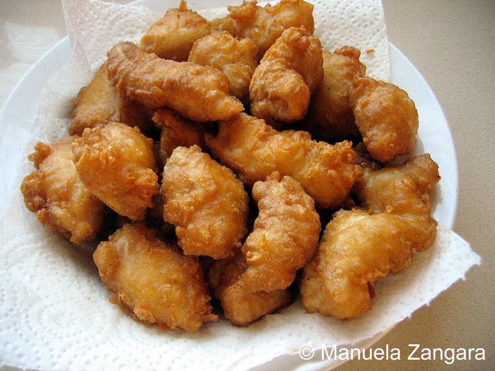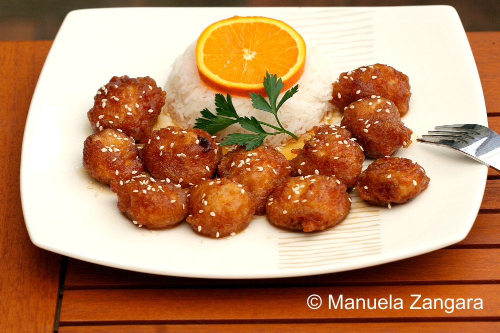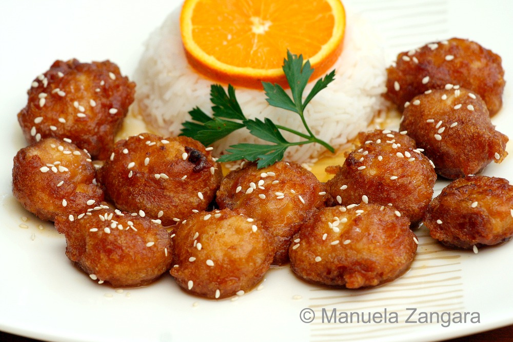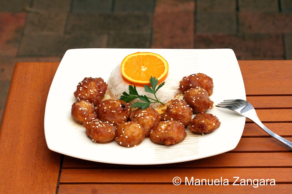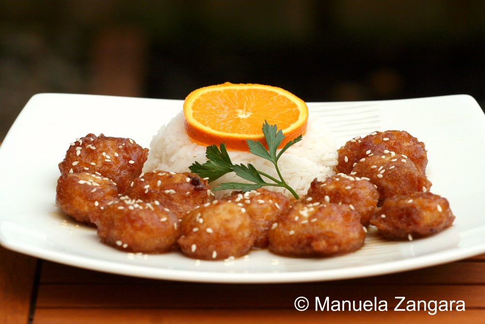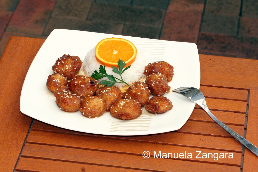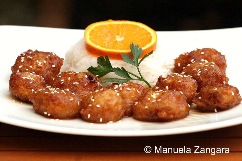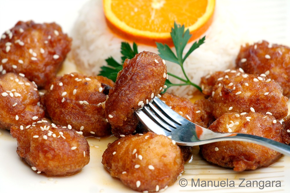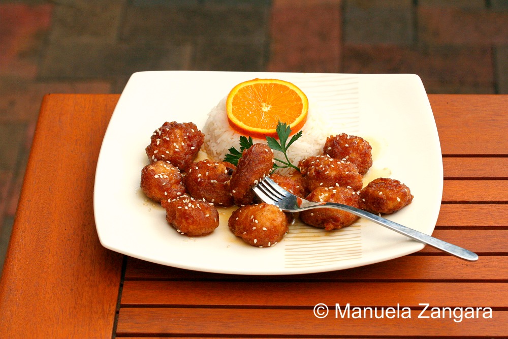 I am a big fan of tangy and savory dishes and a couple of weeks ago I felt like eating Chinese food. So I thought… why not put the 2 things together? I had some oranges on my kitchen benchtop, so I did some research on the internet and came across a very interesting recipe for orange chicken over at Rasa Malaysia. The taste was amazing and the chicken was soft and tangy, but I was not totally satisfied with the batter: adding the chicken fritters into the hot sauce while still on the fire made the batter soften and come apart. This resulted in a messy sauce, with pieces of batter in it! Not really what I had in mind… I guess I was not fast enough with the stir frying (it is really not an “Italian thing”!). The taste though was so good that I HAD to give it another shot and decided to modify the way it was put together. I just added the sauce to the chicken fritters after everything was ready and I can tell you it was delicious, crunchy on the outside and soft on the inside… exactly what I wanted. Just make sure your chicken cooks through when you deep fry it as there is nothing worse than undercooked chicken! Enjoy with some plain or fried rice.