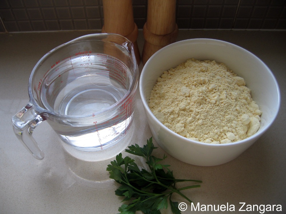 Mix the flour and water together in a pot, making sure too break all the lumps. TIP: if you still get lumps, use a hand mixer to stir well and dissolve them. Add salt and pepper and put the pot on the fire, stirring continuously with a wooden spoon. It is just like making polenta. You will need to obtain a creamy mixture (it will happen pretty fast). Add the chopped parsley, mix and turn the fire off.