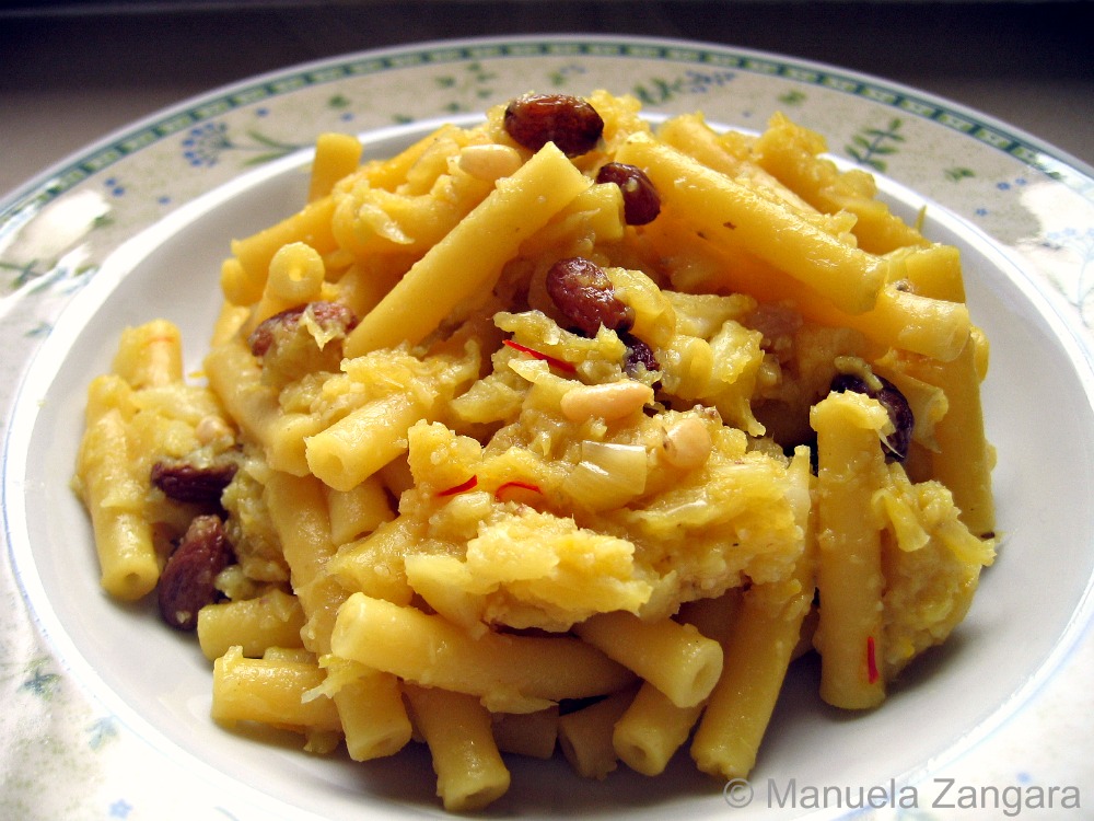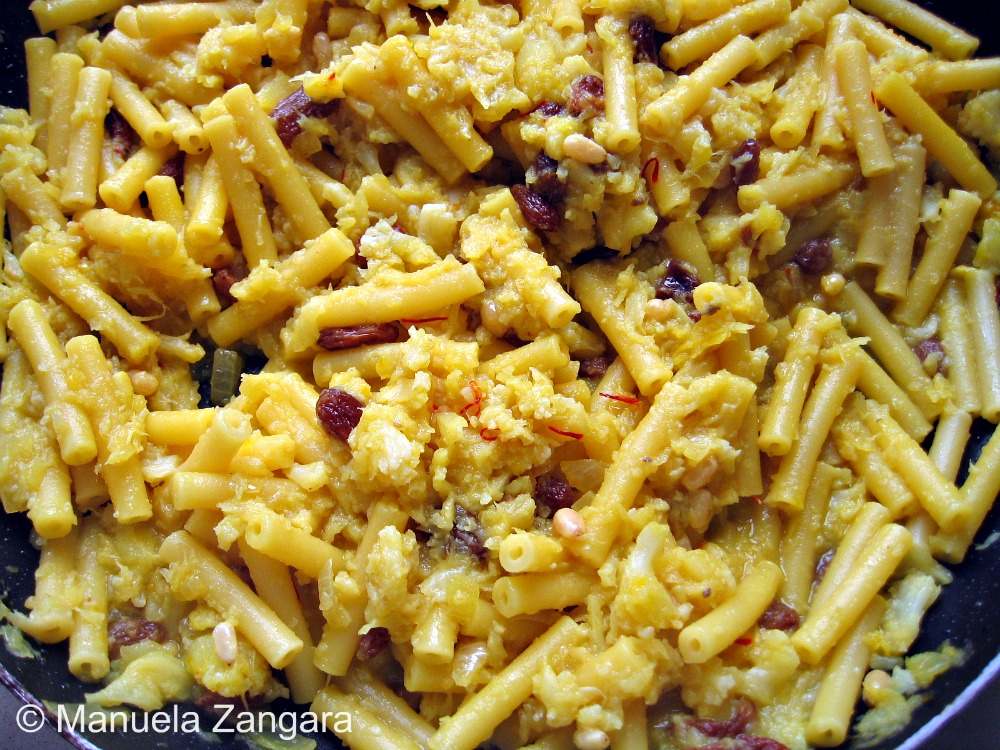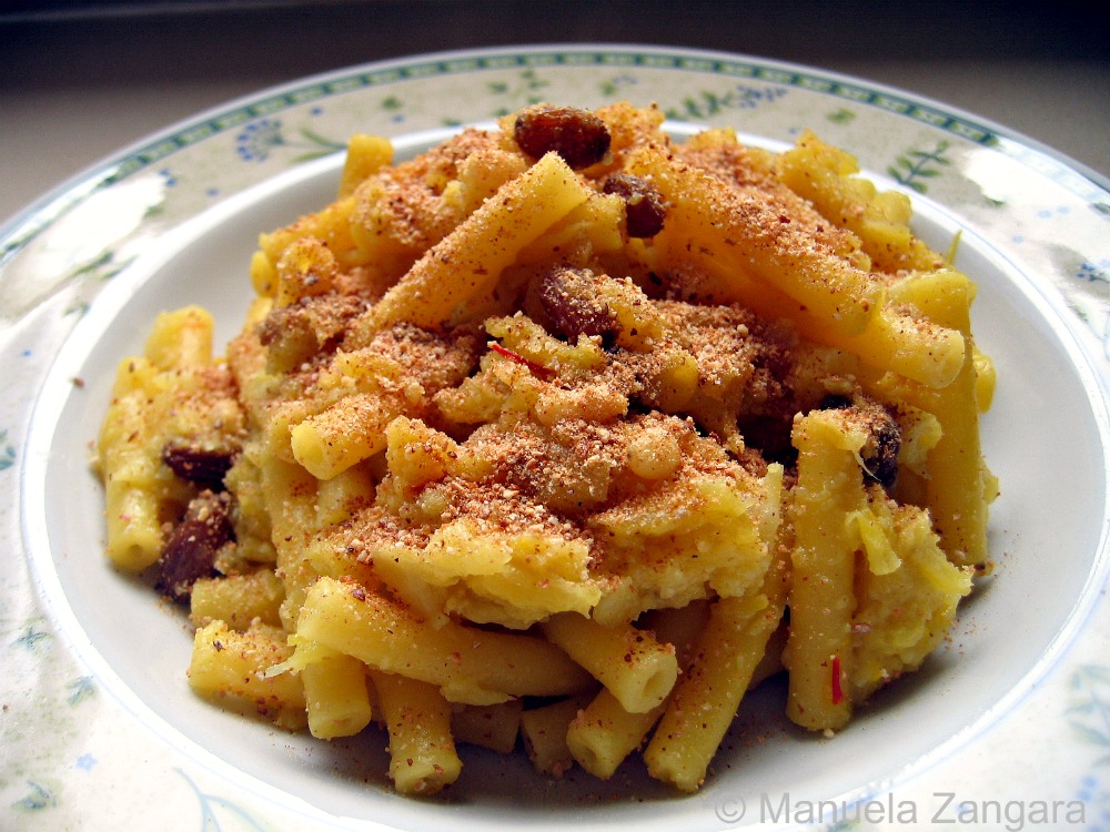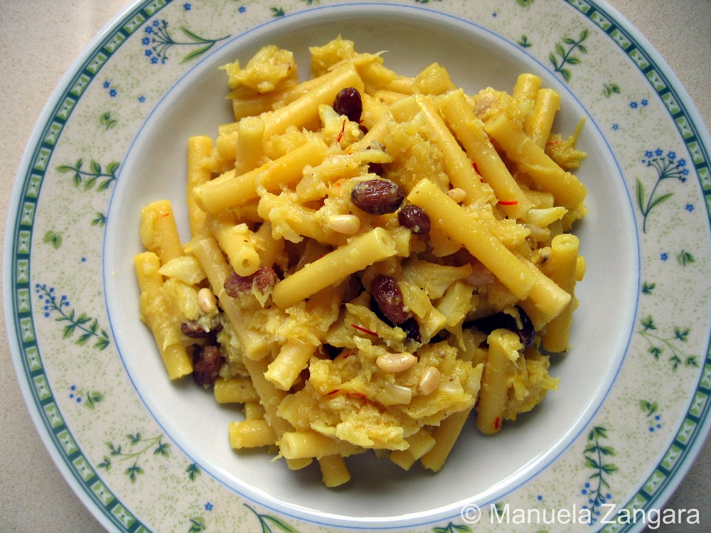 As I have announced in my Vitello Tonnato post, I have decided to dedicate one post a week to Italian cooking, focussing each time on a different region. There are so many fantastic traditional recipes in Italy that it can be a daunting job to choose from them, but I am having lots of fun and I love to help spread “real” Italian cooking out to the world! This week’s region is Sicily. I know I have already published a few Sicilian recipes in the past (for a list of those and all the other regional recipes already published, click here), but here goes another one! I have decided to make pasta with cauliflower, pine nuts, raisins and saffron. This pasta in Sicilian is called “pasta chi vruocculi arriminati” which literally means pasta with stirred cauliflower, because you need to mix the pasta with the sauce in the pan before serving it. The addition of saffron, pine nuts and raisins in savoury dishes is a classic of Sicilian cooking and it can be attributed to the Arab influence that is so evident in Sicily due to centuries of Arab (and then Spanish) domination. This is a typical dish from Palermo and it is my dad’s family recipe. It is best eaten with short pasta and served with “muddica” (toasted breadcrumbs), instead of cheese.
