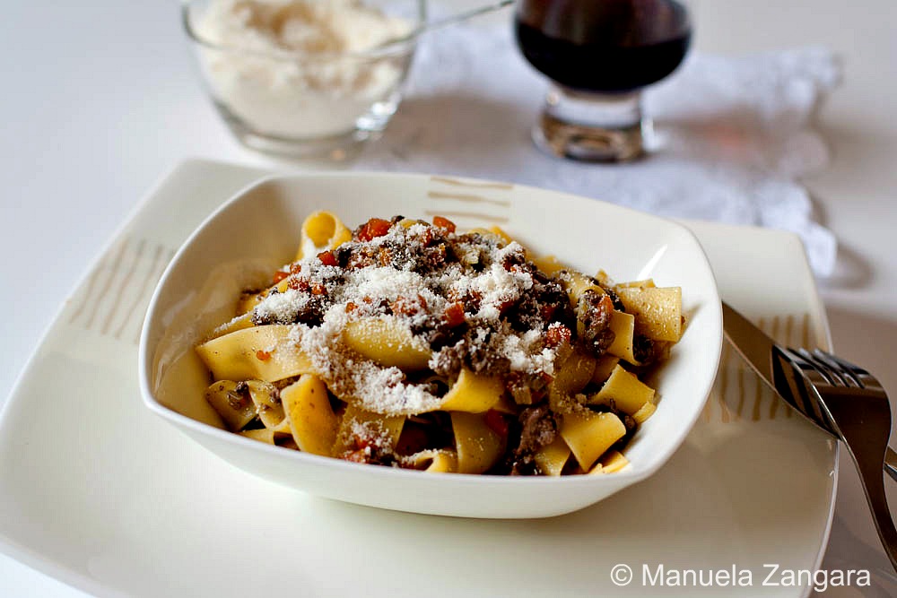Cook the pappardelle following the steps on How to cook pasta “al dente” in the Techniques page of this site. Drain it and serve with the chicken liver sauce and thinly grated Parmigiano Reggiano on the top.