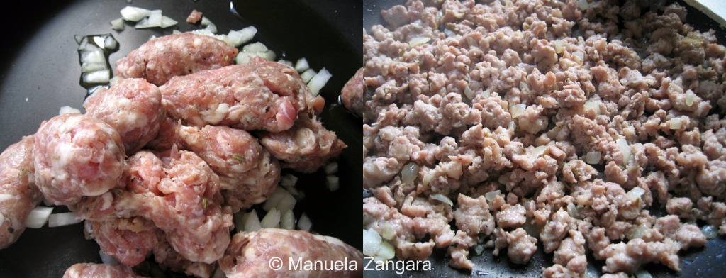 Put the chopped sausage in a pan with the onion and extra virgin olive oil and brown it well breaking all the lumps with a wooden spoon.