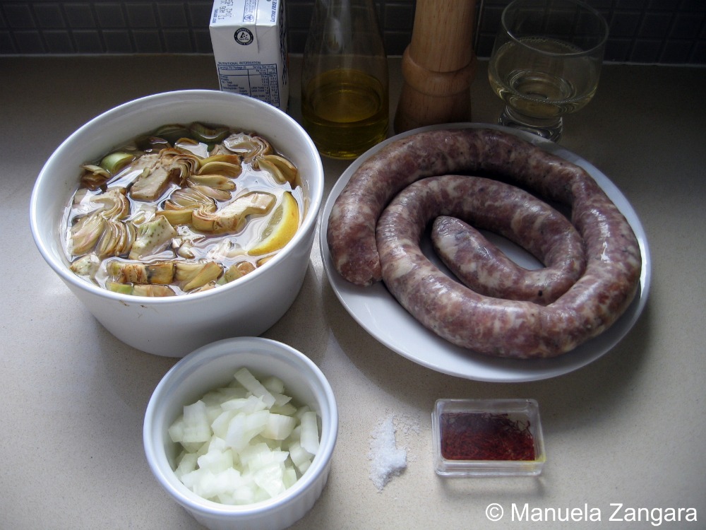 We all love sausage in our family. When I say sausage I am referring to the Italian style sausage made of pure pork. I am lucky enough to find some good quality Italian style sausage in Sydney, nonetheless I often make it at home from scratch, as nothing beats home-made things (I used my home-made sausage fro this recipe). The sausage l prefer is the Sicilian one, made of pure pork and with fennel seeds… it is great for a barbecue but it is also delicious with risotto and pasta. Today l want to share with you a recipe that l originally came up with to use up a few left overs and that has since then made regular appearences on our dinner table. It is a very simple dish to make and it tastes really good. It is perfect for a dinner party as the addition of cream and saffron makes it elegant enough to impress your guests! Buon appetito!