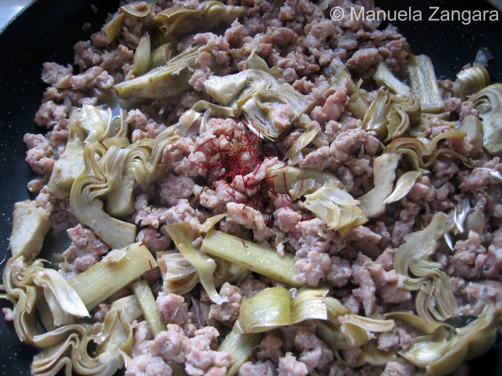 Now add the saffron, salt and pepper and ¼ glass of water. Cook it for a few minutes until the artichokes are soft. When ready, keep it aside.