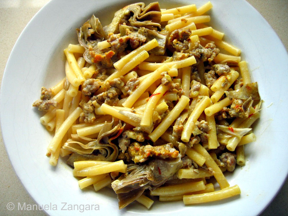 Oh, Manu! What a fabulous pasta dish…we love Italian sausage, too…and with artichokes, saffron and pasta, you’ve transformed ordinary sausage into an incredible meal!