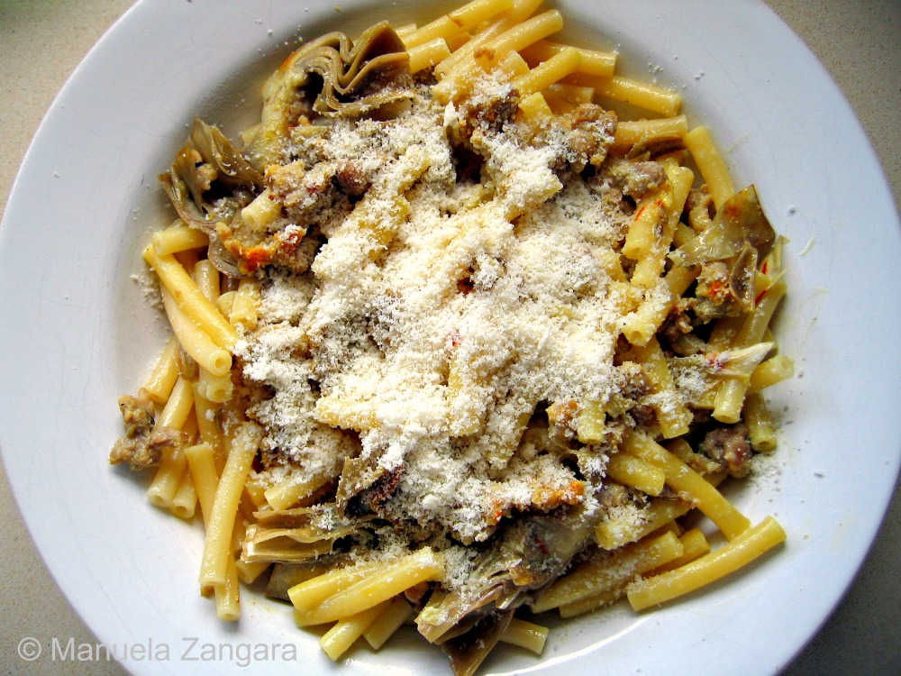 Cook the pasta following the steps on How to cook pasta “al dente” in the Techniques page of this site, but drain it 1 minute before it is cooked as it will finish cooking together with the sauce. Put the drained pasta in the frying pan with the sausage and carciofi sauce, add the cream and mix well while cooking it on a slow flame for 1 or 2 minutes.