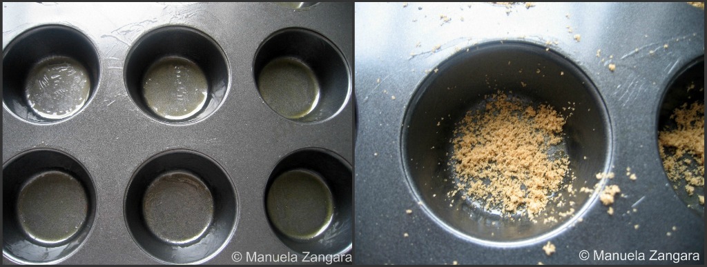 Brush the muffin pan with the melted butter and sprinkle the brown sugar in the bottom of each cup.
