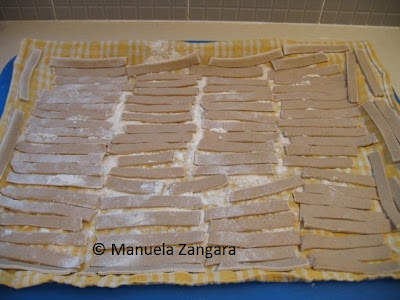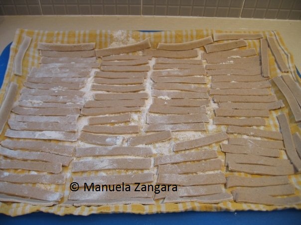 Roll the dough with a rolling pin until you get a 2-3 millimetres thick sheet from which you have to cut strips 7-8 centimetres wide. Then put them one on top of the other and cut again to obtain the pizzoccheri (short noodles half a centimetre wide). This sounds a bit confusing… but it is quite simple… just look at this picture: