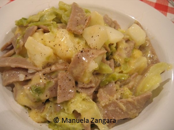 Cut the cabbage into pieces and cook it together with the cubed potatoes in salted boiling water. After 5 minutes add the pizzoccheri and let cook for ten minutes. In the meantime brown the butter with some garlic and 4 sage leaves.