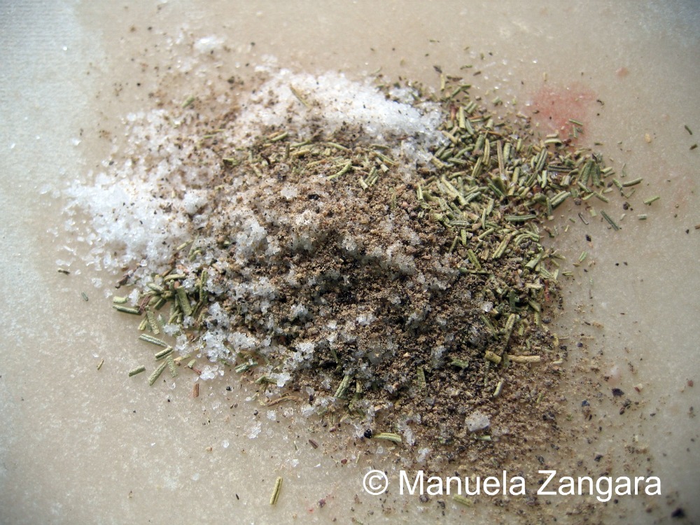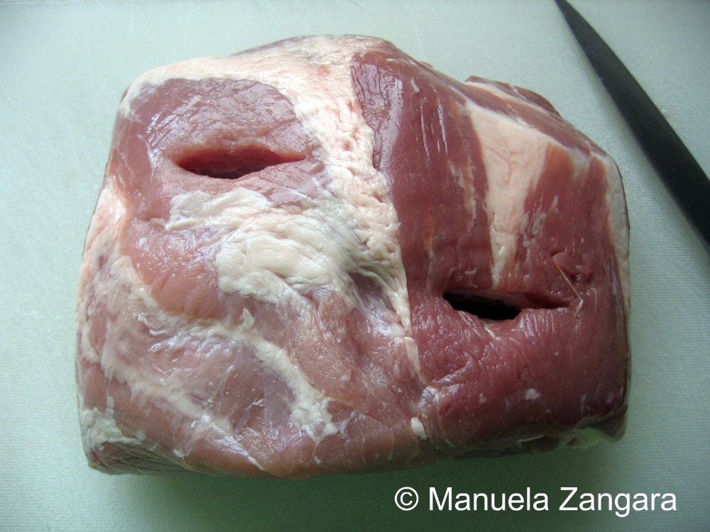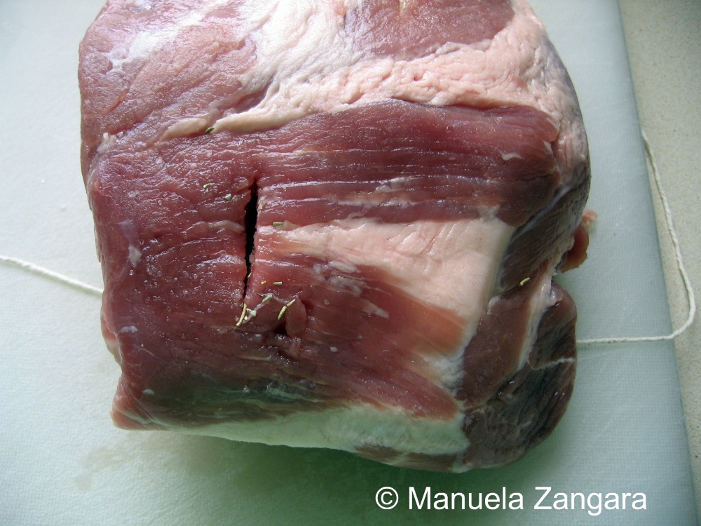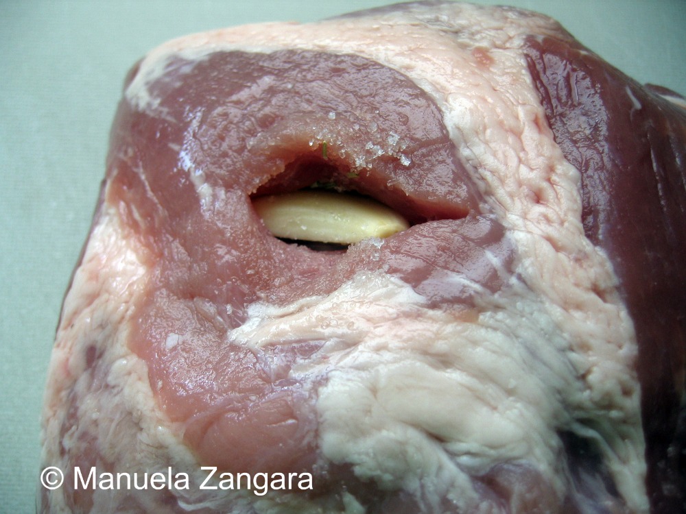 Start by making four small cuts in the meat. Insert half a clove of garlic, a pinch of salt and pepper in each cut.