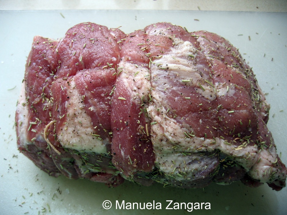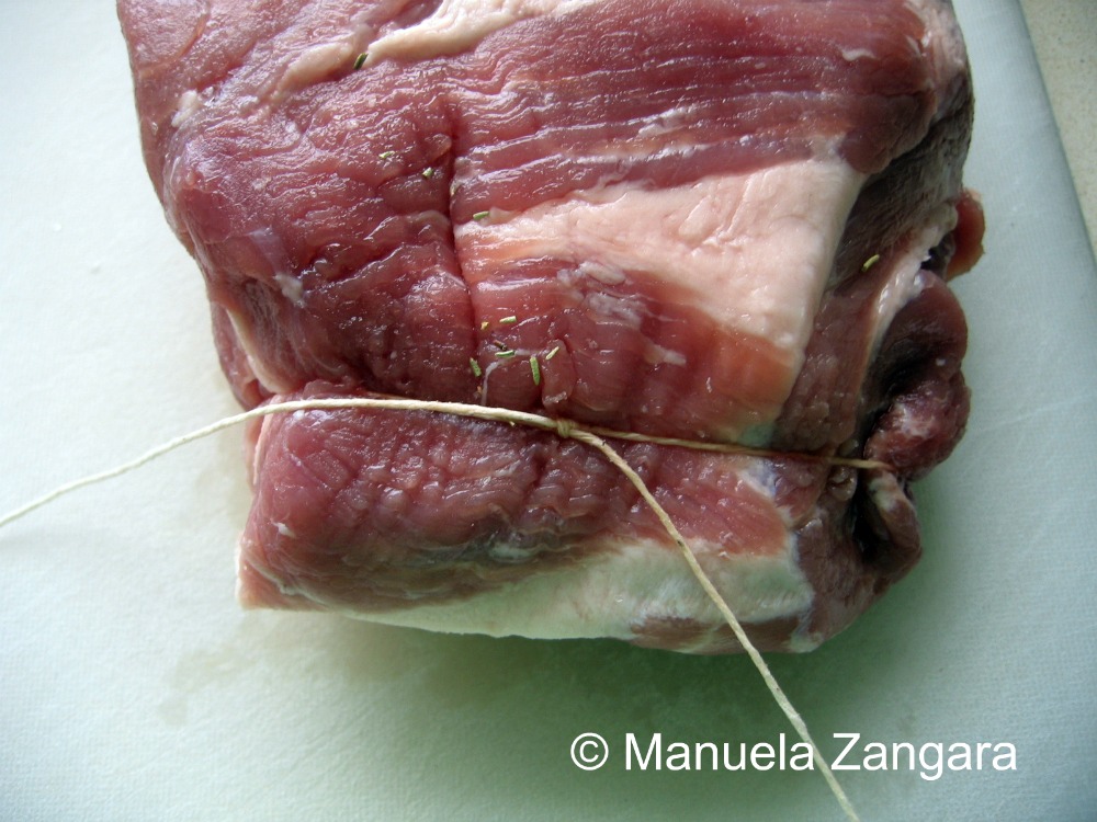 Now you can give the roast a more uniform shape. This is an optional step, the roast will taste just as good without doing this, but it won’t look as “nice”. Using some butchers’ string, tie the roast by knotting the string tightly at one end of the roast and wrapping it tightly all around the meat. Make a knot at the end to secure the string.