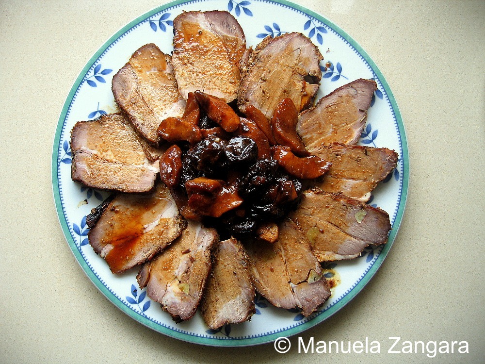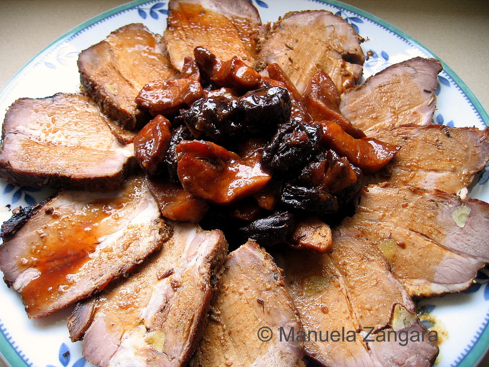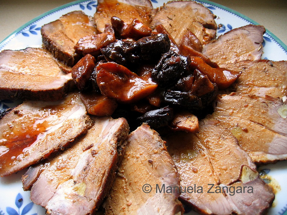 When cooked, let it cool down. Then remove the string and slice. Serve warm with its sauce and the apples & prunes.