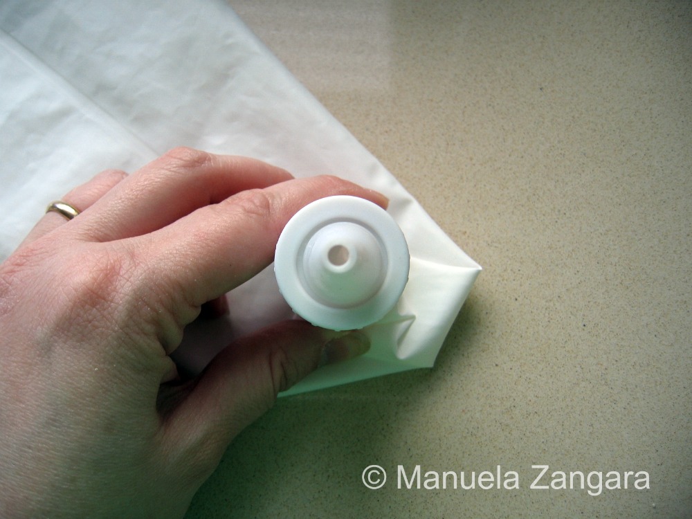 On the day you want to bake your macarons, make sure you have everything ready, BEFORE you start making your shells. Prepare the piping bag with the right nozzle (a normal circular nozzle of about 1 cm in diameter) and line your oven trays with baking paper or with a silicone cookie mat.