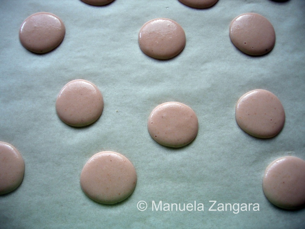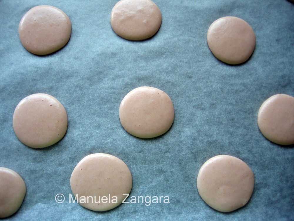When ready, take the shells out of the oven and let them cool down BEFORE attempting to detach them from the baking paper/silicone mat… if you try to detach them before, they may break and you will ruin those nice feet on the macaron! So be patient. If you still cannot detach them easily, you can also put them in the freezer for a couple of minutes… they will come off easily then.